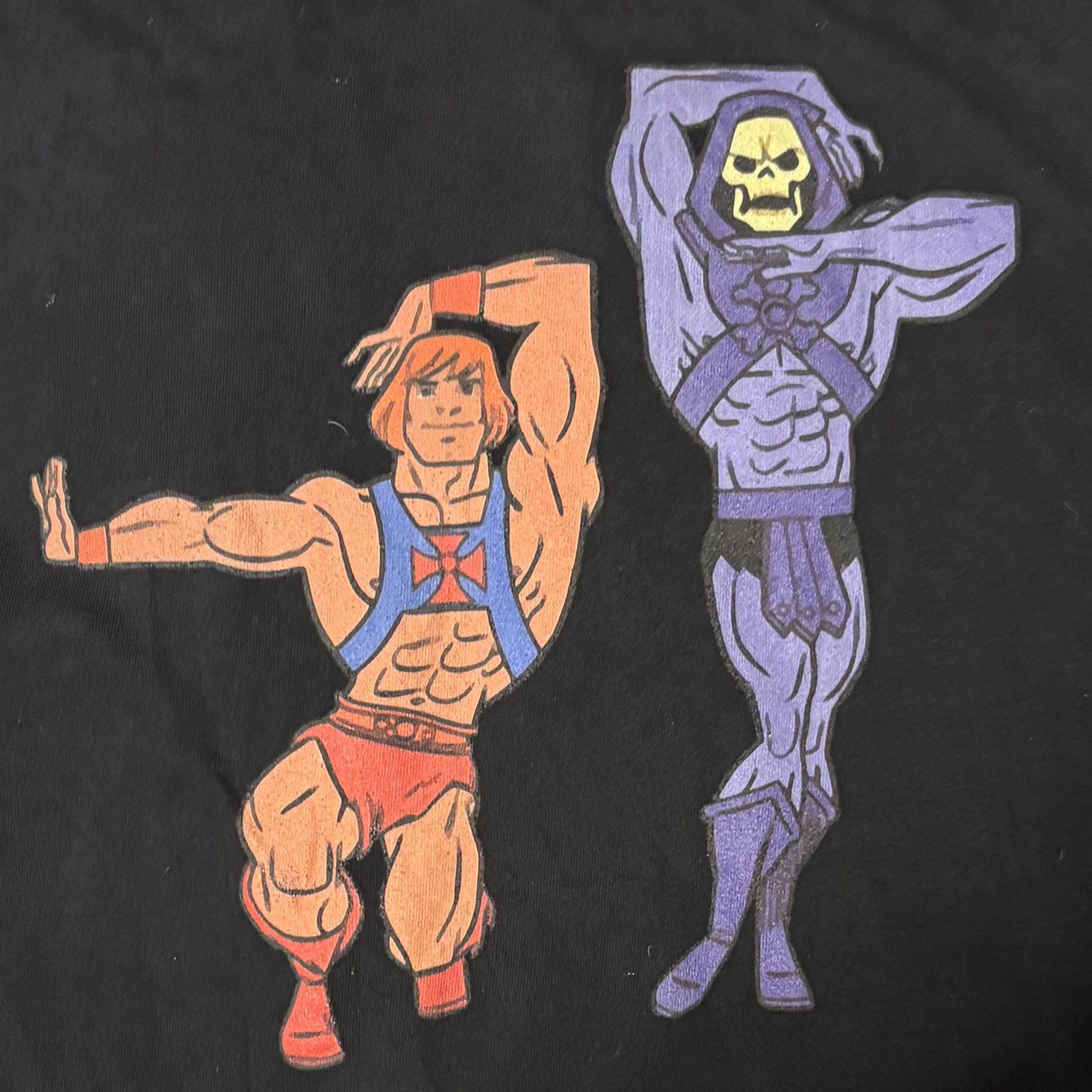 Black graphic long-sleeved t-shirt featuring the Masters of the Universe characters He-Man and Skeletor in "voguing" poses. Mens size XL. Pre-owned and in good condition (no stains, holes, or tears). "Eternia is Burning"or “House of Grayskull," a parody referencing the film Paris Is Burning and the dance style of voguing.