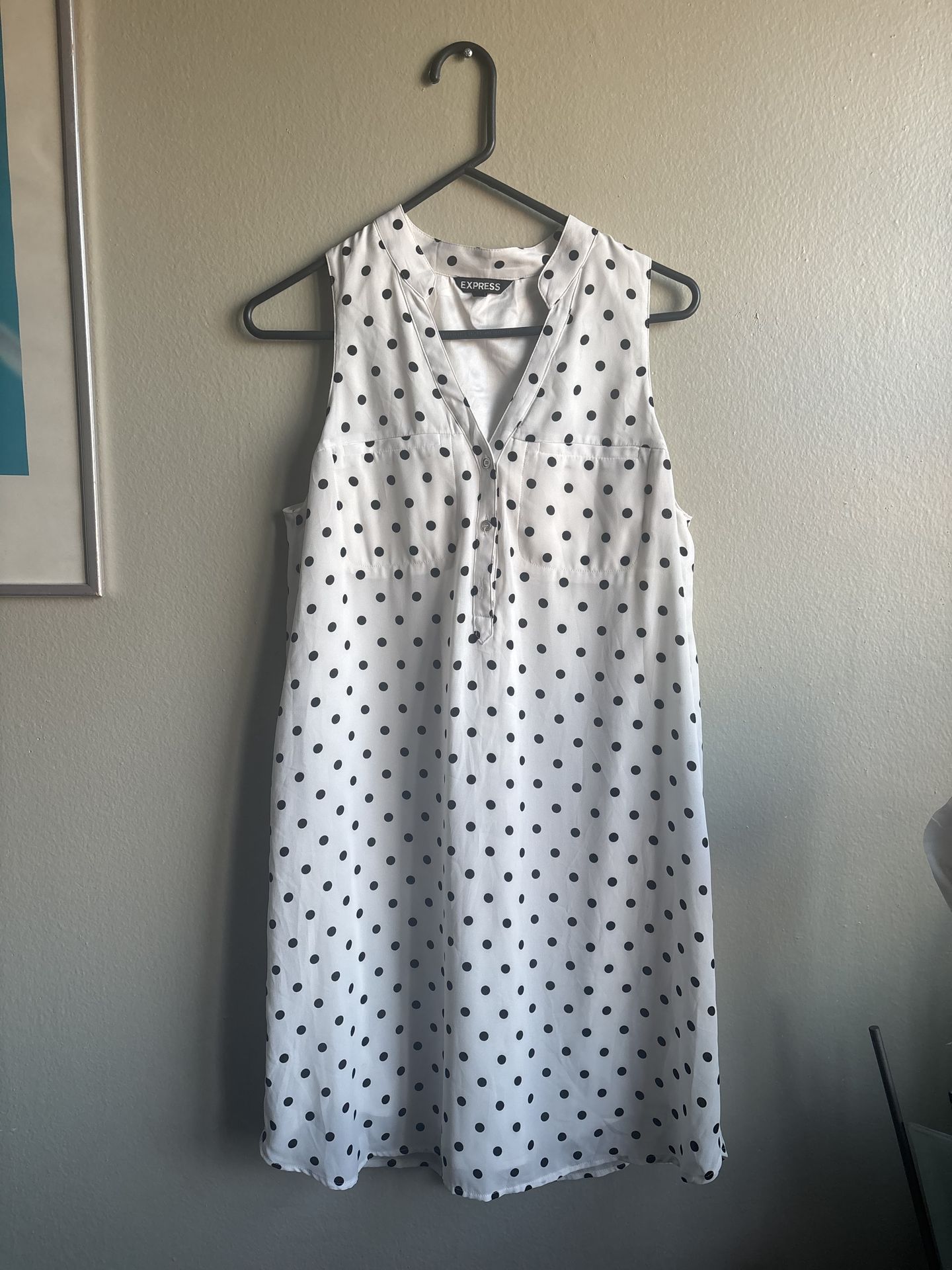 white and black polka dot dress with pockets and belt loop (no belt) #polkadot