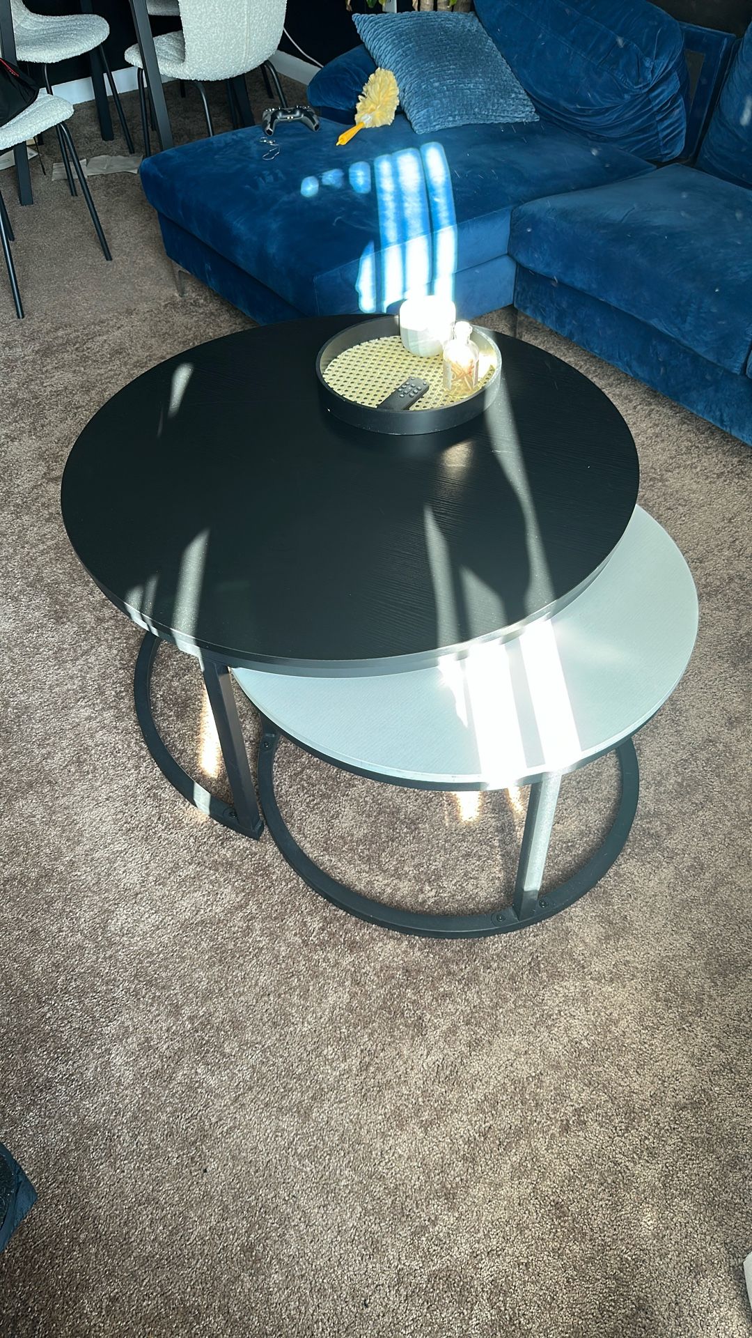 THREE FLEXIBLE USAGES - The set of 2 stacking coffee tables can be separately used in two locations, or completely stacked on each other to act as one space-saving table, or partially stacked to give you large storage & display space. MINIMALIST & MODERN - The nesting center table set features simple design and characteristic functionalities. The classic combination of black and white enables these accent coffee tables to matching any room style. FAMILY-FRIENDLY & SAFE - The round coffee table set is much safer for a family to use compared with rectangular coffee tables, as the rounded corners can avoid accidental bumps and scratches. SOLID CONSTRUCTION - The set of 2 coffee tables are made from semi-circular steel frame and thick wooden tabletop, able to support 180 lbs. The adjustable feet pads also increase the stability. The black & white tabletops are covered by scratch-proof & stain-proof finish. EASY ASSEMBLY & EASY MOVEMENT - The wooden coffee table set can be assembled within 15 minutes and be lightweight to be moved to any desired places. Dimensions of large table: ( 33.9“×18.5”), dimensions of small table: (26 “×16.5”).