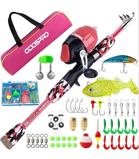 Kids Fishing Pole Pink, Portable Telescopic Fishing Rod and Reel Combo Kit - with Spincast Fishing Reel Tackle Box for Girls, Youth Size M - 1.5M