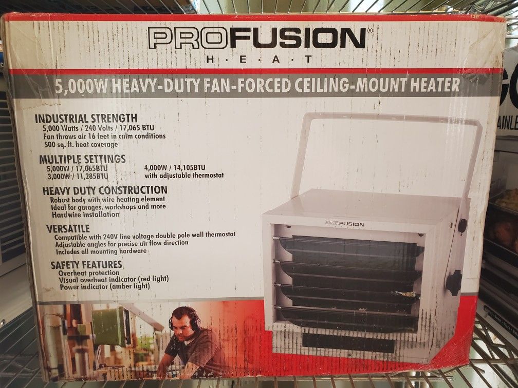 New in box and used available. 240v, heats 500 Sq feet. 5000watt ceiling mount heater. Warm your shop/garage.