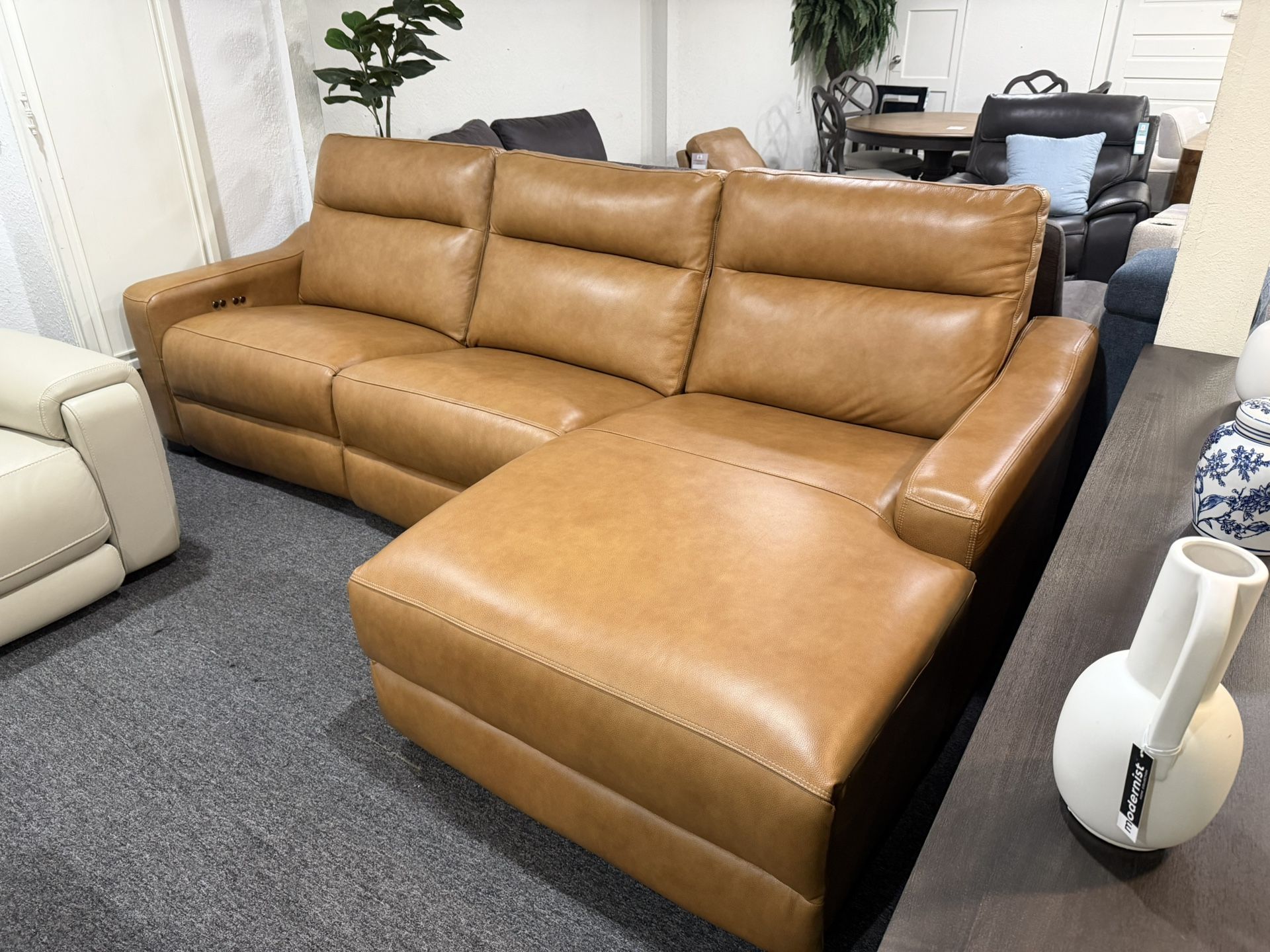 114"W x 40" x 39.5"H Retail price: $5,797 The Gabrine with its full dense foam, buttery smooth leather, lumbar support and powered no recliners provides high comfort and support paired with durability and quality. The switch panels are located on each inner sides. The option for chaise on either side is available. Delivery available Financing available Store display item