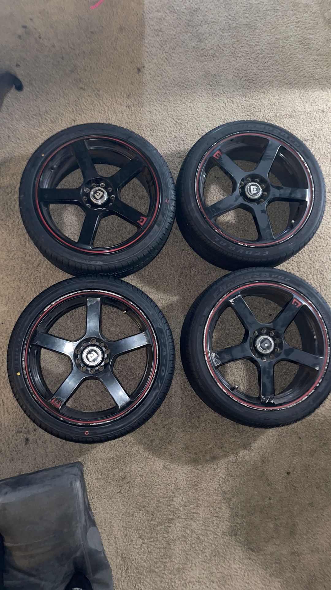 1 New Front Rim 2 New front tires ($300) 18x8 225/40 5x114.3 / 5x112 Used set of wheels 3 are curb rashed, was planning on fixing… Testing waters