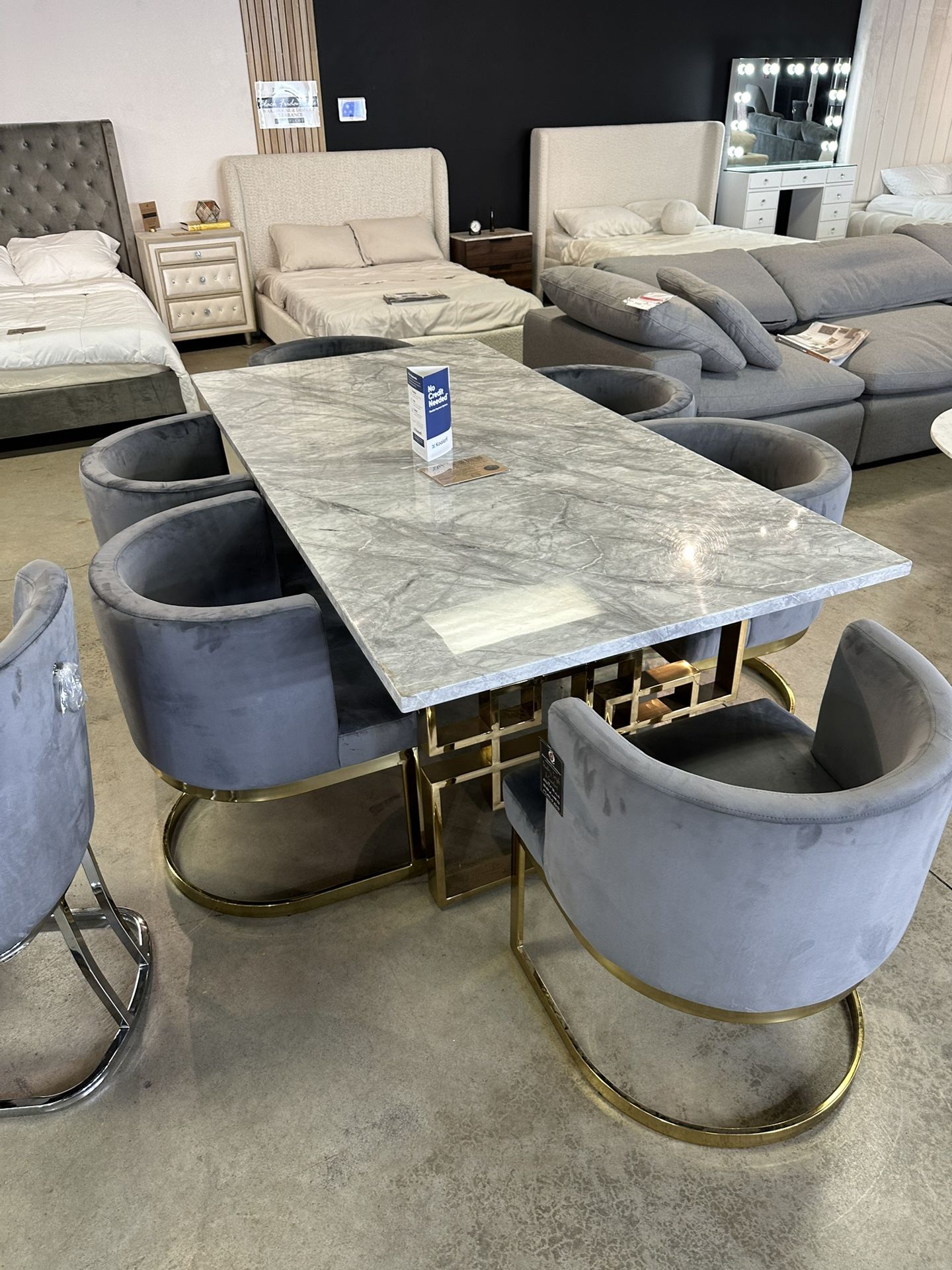 Luxury Designs at Everyday Prices as part of our Black Friday Sale up to 70% OFF This Item Qualifies for FREE Delivery 79” solid marble top with acrylic protectant table & stainless steel gold base & 6 heavy duty velvet chairs in gray ( more colors available upon request ) Originally $2,990 We offer NO Credit Financing - Apply Today 💳 Shop top furniture quality at BELOW Retail Prices as we clear Warehouse & Display. If you’re looking for something in specific let me know & I can check our inventory list ✅ ( over 100+ items in stock ) Visit us this week or message us for personal assistance online shopping 👍🏻