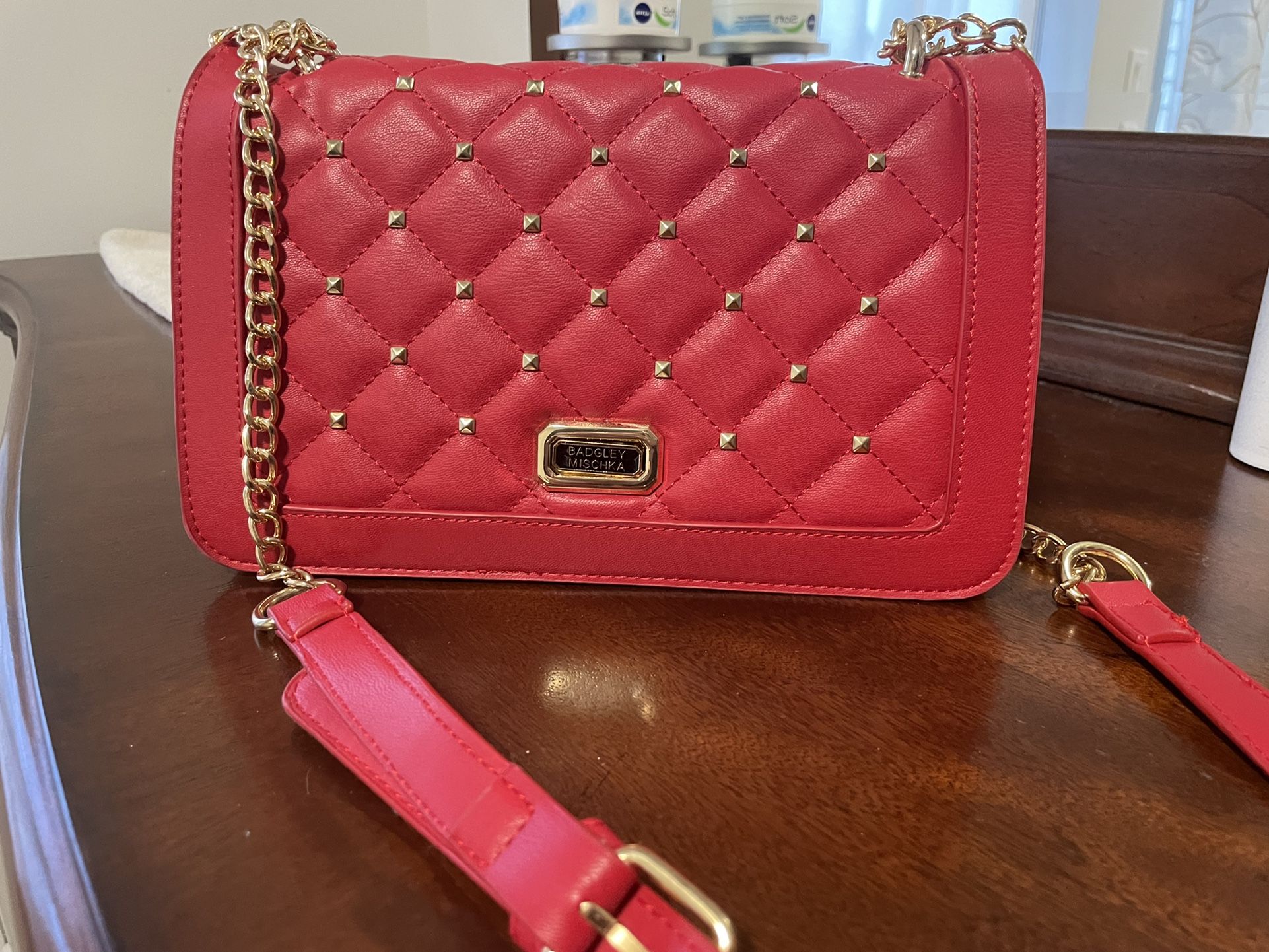 Brand new cross body bag, never used. Red leather with gold chain detailing.