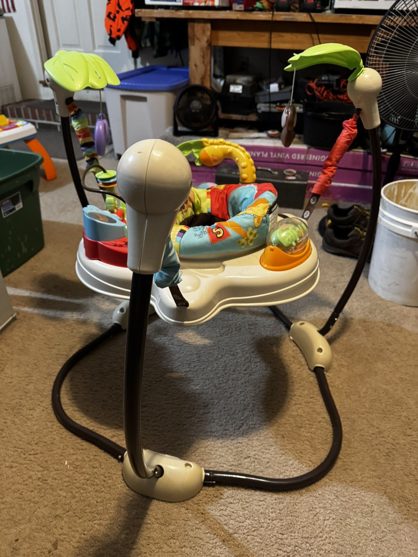 1-Used baby bouncer, adjustable three levels, seat spins around. Needs batteries 2-Busy table for your toddler learning to walk and play at. Needs batteries. Must pick up.