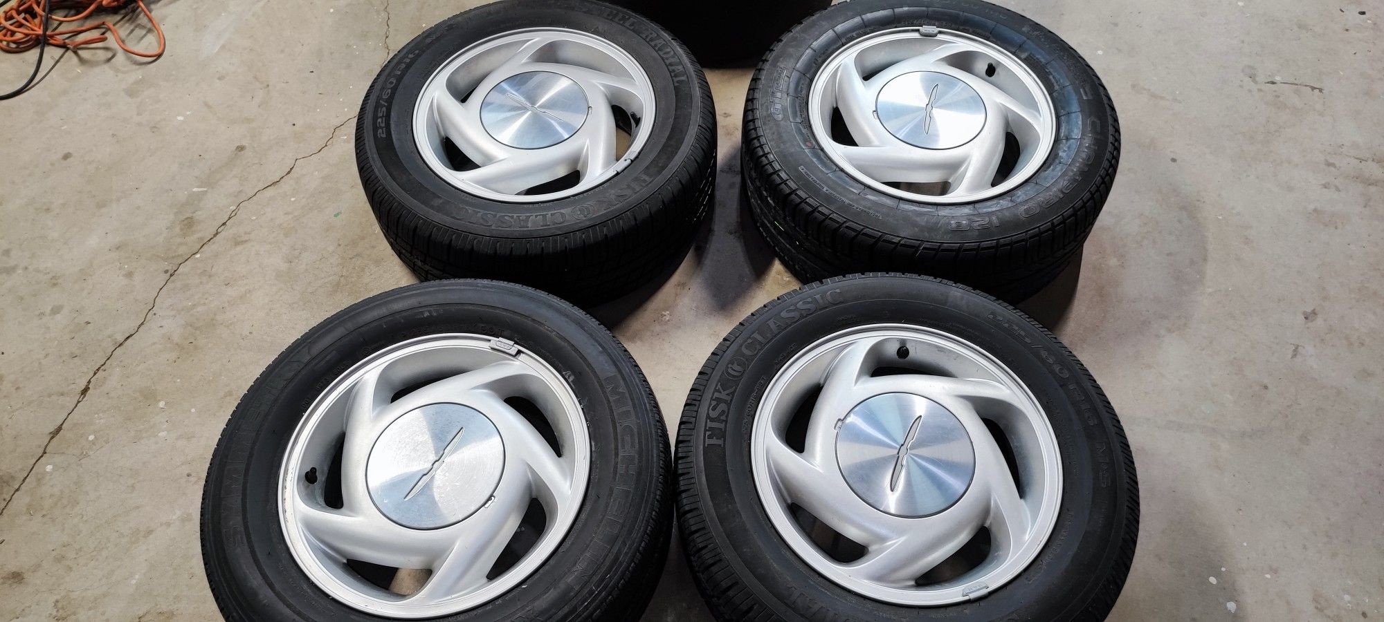 This are of a thunderbird super coupe rims of 4 with tires. A 5 bolt pattern 5x4.25 rim and tires have 85% tread. The fronts are 225/60/16 .The back tires are 235/60/16.