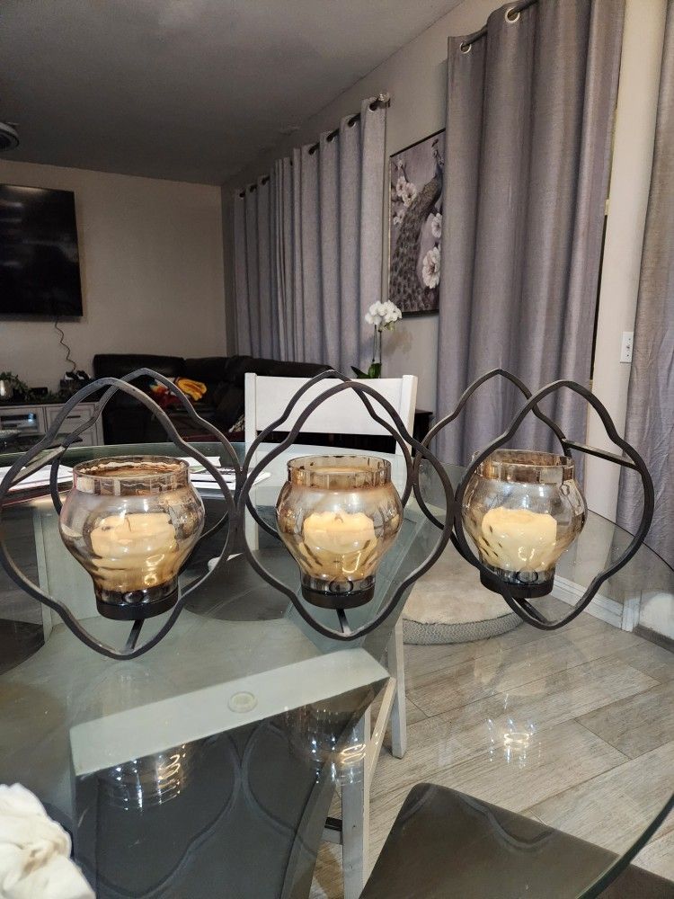 Very good condition decoration candle holder centerpiece measures 9X22 in. Candles included