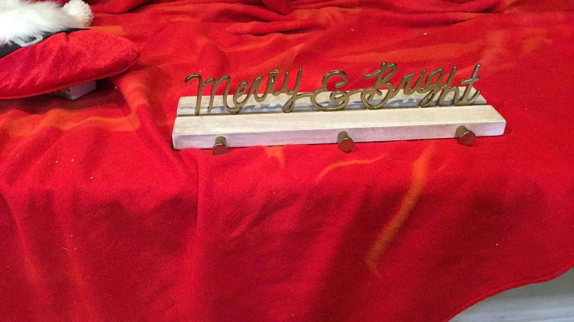 Brass stocking holder. Merry & Bright. 3 hooks. Santa stocking used strictly as decoration.