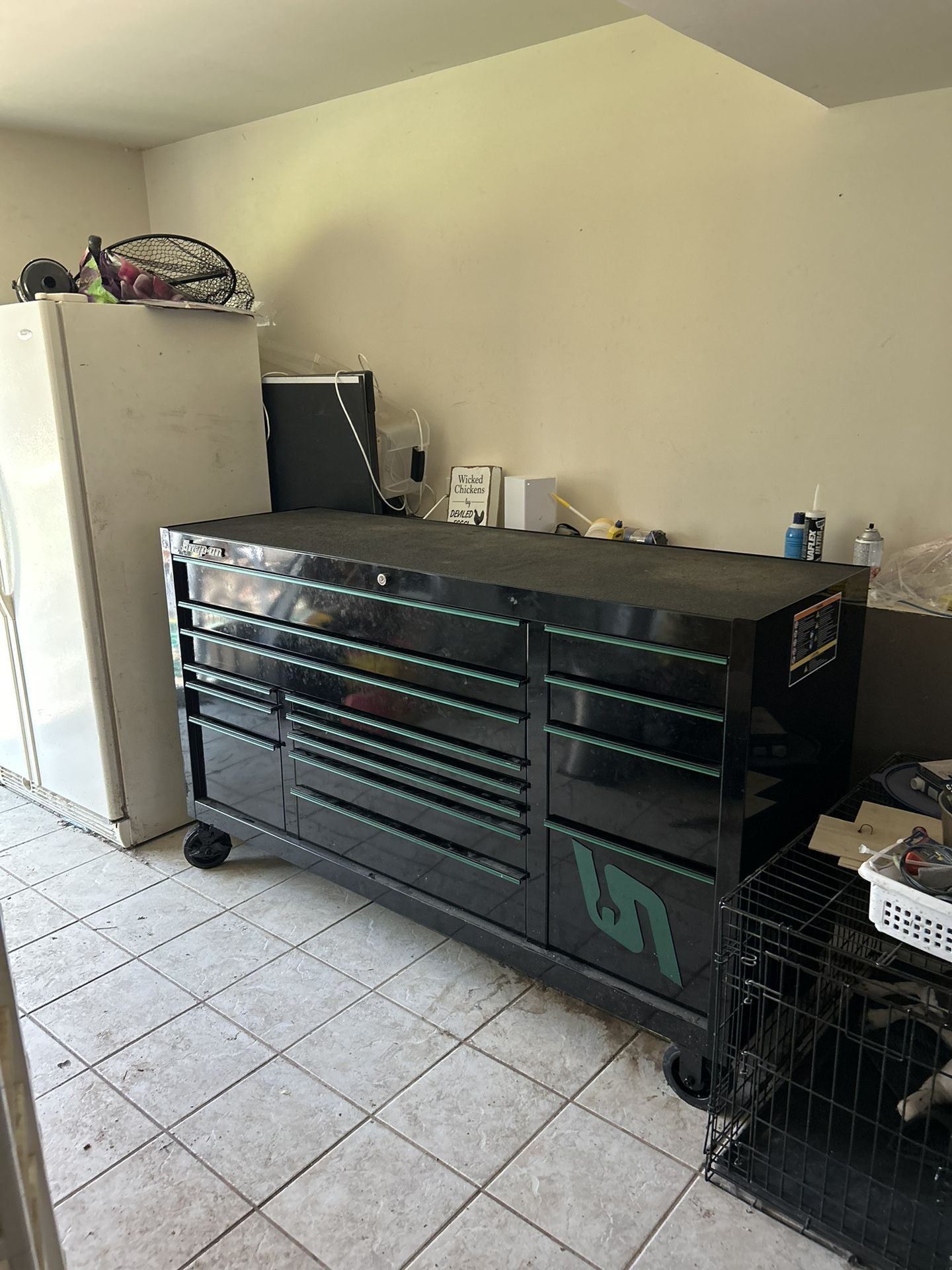 Black chest with green trim. 15 drawers including a power drawer and a drawer with power tool rack. Does not include tools. Only a little over a year old in like new condition.