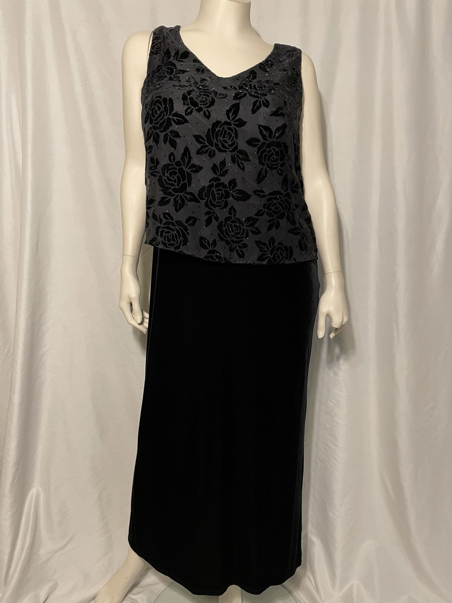 Floor length formal black evening gown ladies size sixteen. Faux two piece. Stretchy velour skirt. Lined, sleeveless, textured top. Wedding, quinceanera, cruise, other special occasions. Location near Greenway Road and 40th Street Phoenix Arizona.