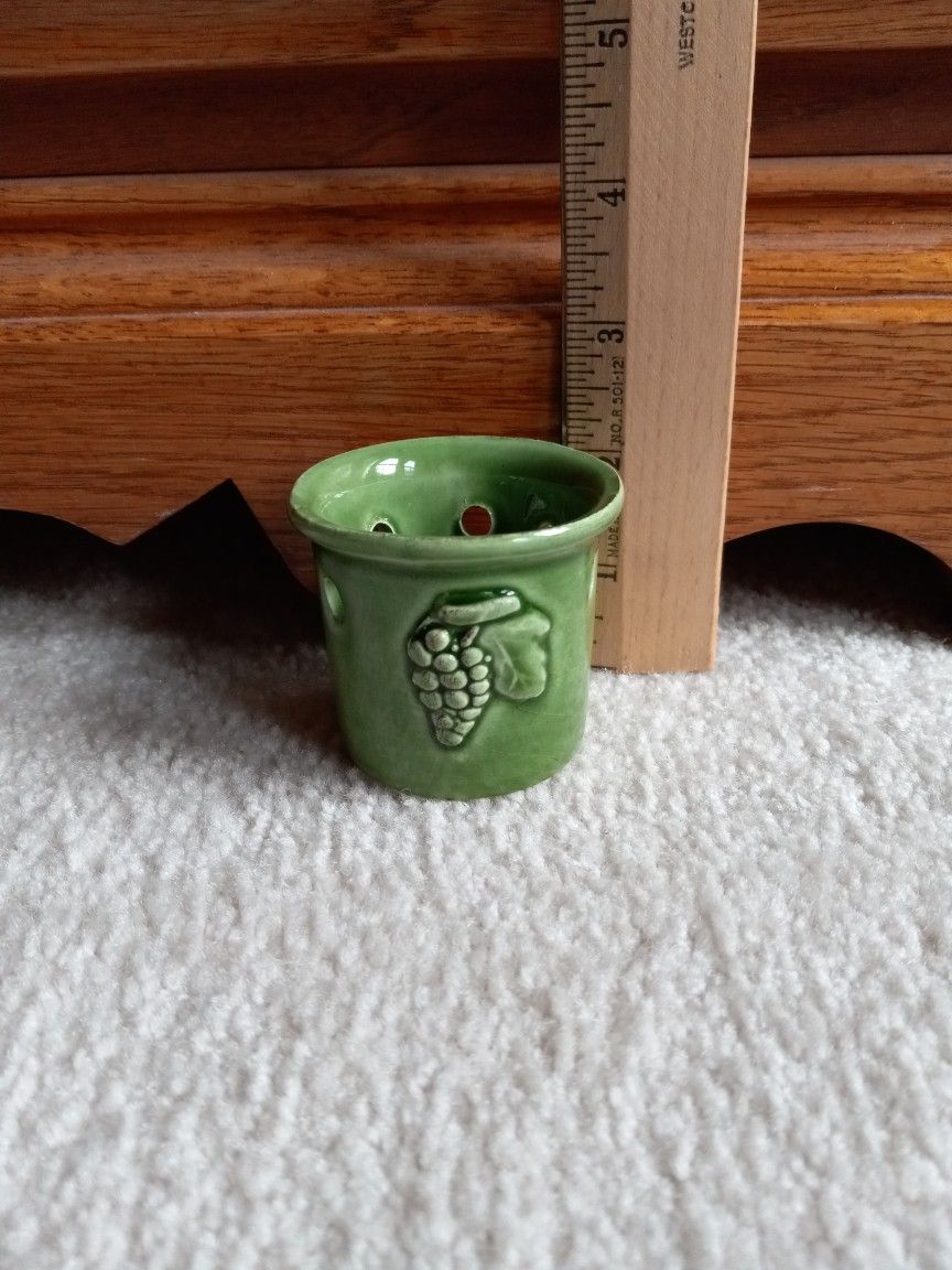 Sur la Table ceramic votive or tea light candle holder, green with grape decor in good condition. Holder measures just over 2" tall and has a 2 1/3" diameter. Smoke free, pet free home.
