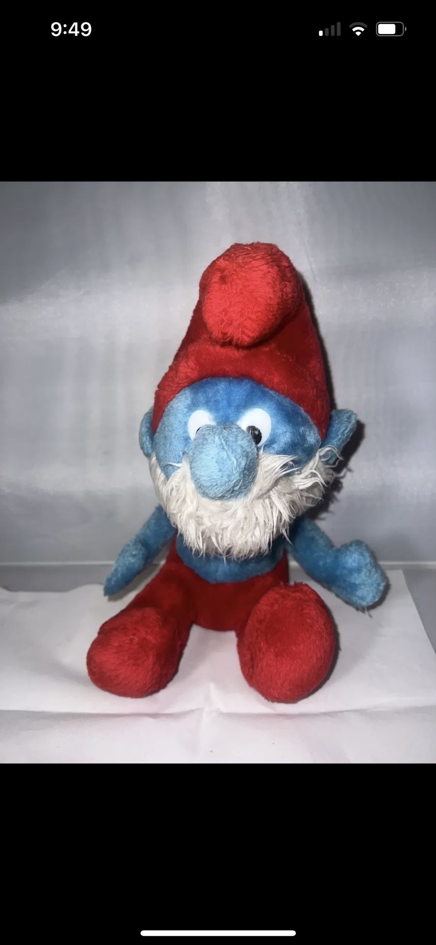 This vintage Peyo Papa Smurf plush toy is a must-have for any fan of The Smurfs franchise. Made in 1979 by Wallace Berrie, this 12-inch toy is filled with beans at the bottom for stability. The material used is soft plush, making it perfect for cuddling or displaying as a collectible item. This item is a great addition to any collection of animation merchandise, especially for fans of The Smurfs. It is a used item but remains in great condition and is sure to bring joy to any fan. Get your hands on this vintage Papa Smurf plush today!