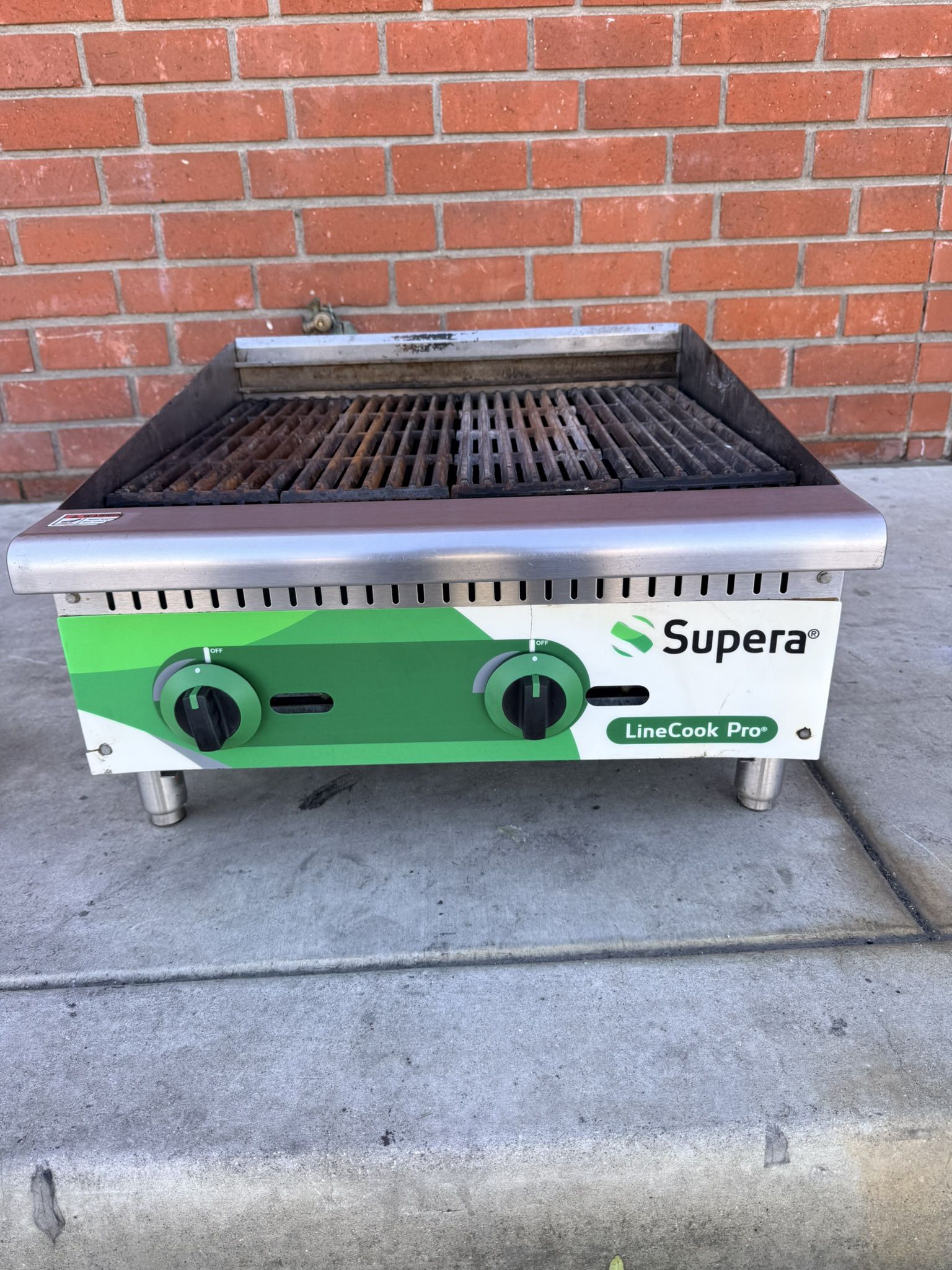Supera char broiler 24” commercial Natural Gas 2 burner 70,000 btu’s works great missing crumb tray Working Condition comes with 30 day warranty Look at my other listing for more restaurant/bar supplies. ***Follow for updates on new listing daily*** Delivery available ask for quote Family owned Restaurant equipment and supply store We sell new and used restaurant supplies