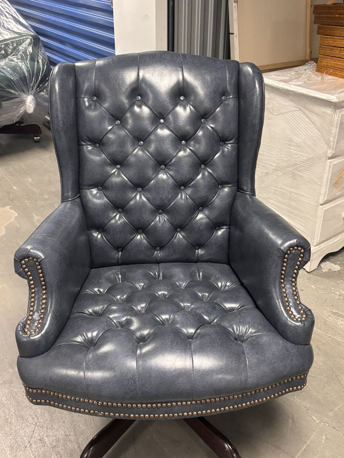Classic and comfortable tufted wingback chair with a smooth gray leather-look upholstery. Features deep button tufting on the back and seat, rolled arms with decorative nailhead trim, and a sturdy swivel base—perfect for a home office, study, or living room accent chair. High back provides great support while the plush cushioning makes it comfortable for extended sitting. Elegant, timeless design that works well in both traditional and modern spaces. Clean and well-kept with no major flaws. Details: • Color: Gray • Style: Wingback / Executive • Features: Button tufting, nailhead trim, swivel base • Condition: Very good