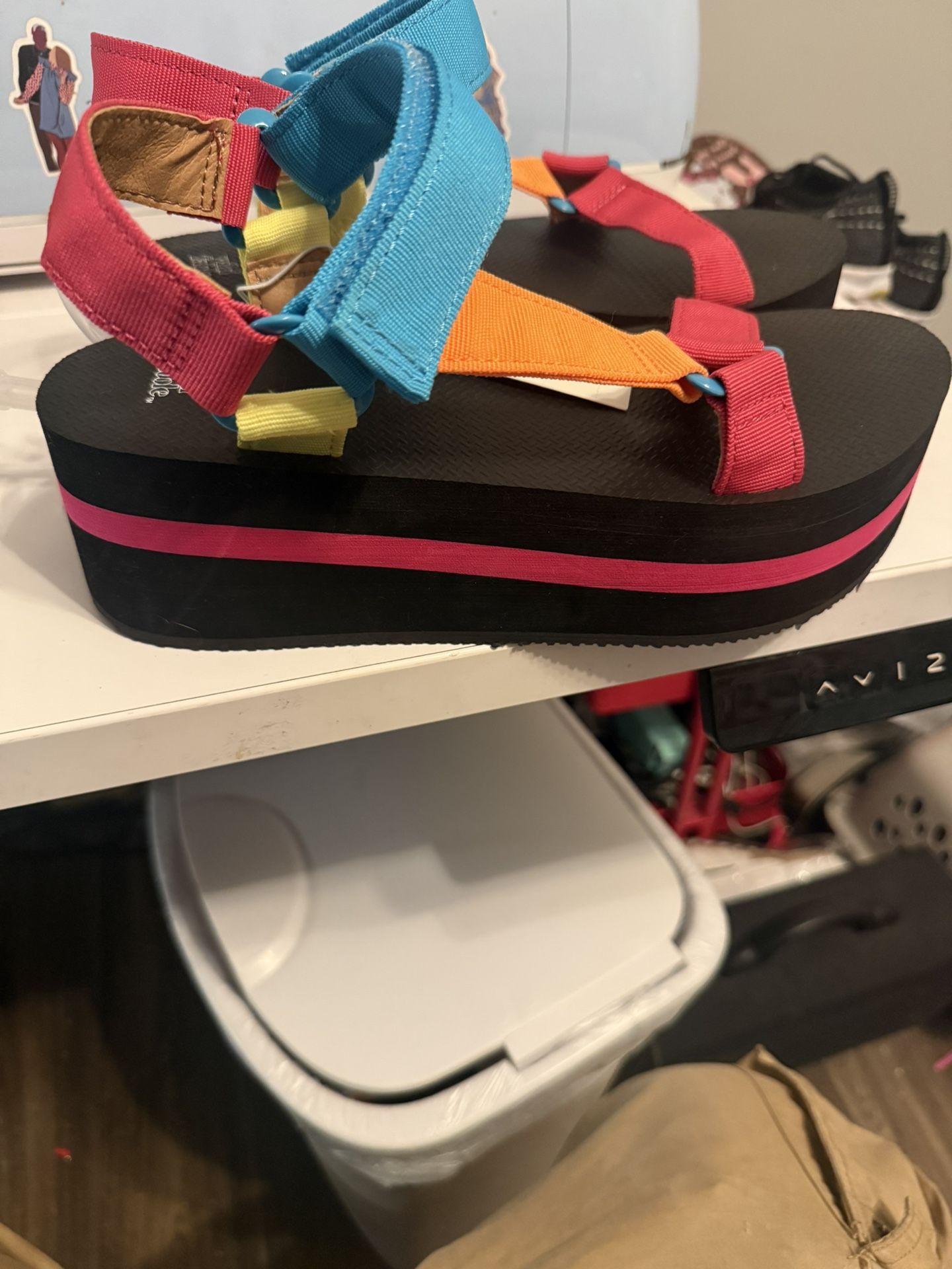 Brand Wild Fable (Target's in-house brand) Style Jolene Platform Sandal Color Multicolor (Pink, Orange, Blue, Black sole) Heel Height Approximately 2.25-inch platform Features Asymmetrical front straps, adjustable ankle strap with hook-and-loop closure, textured rubber-like outsole, open-toe design