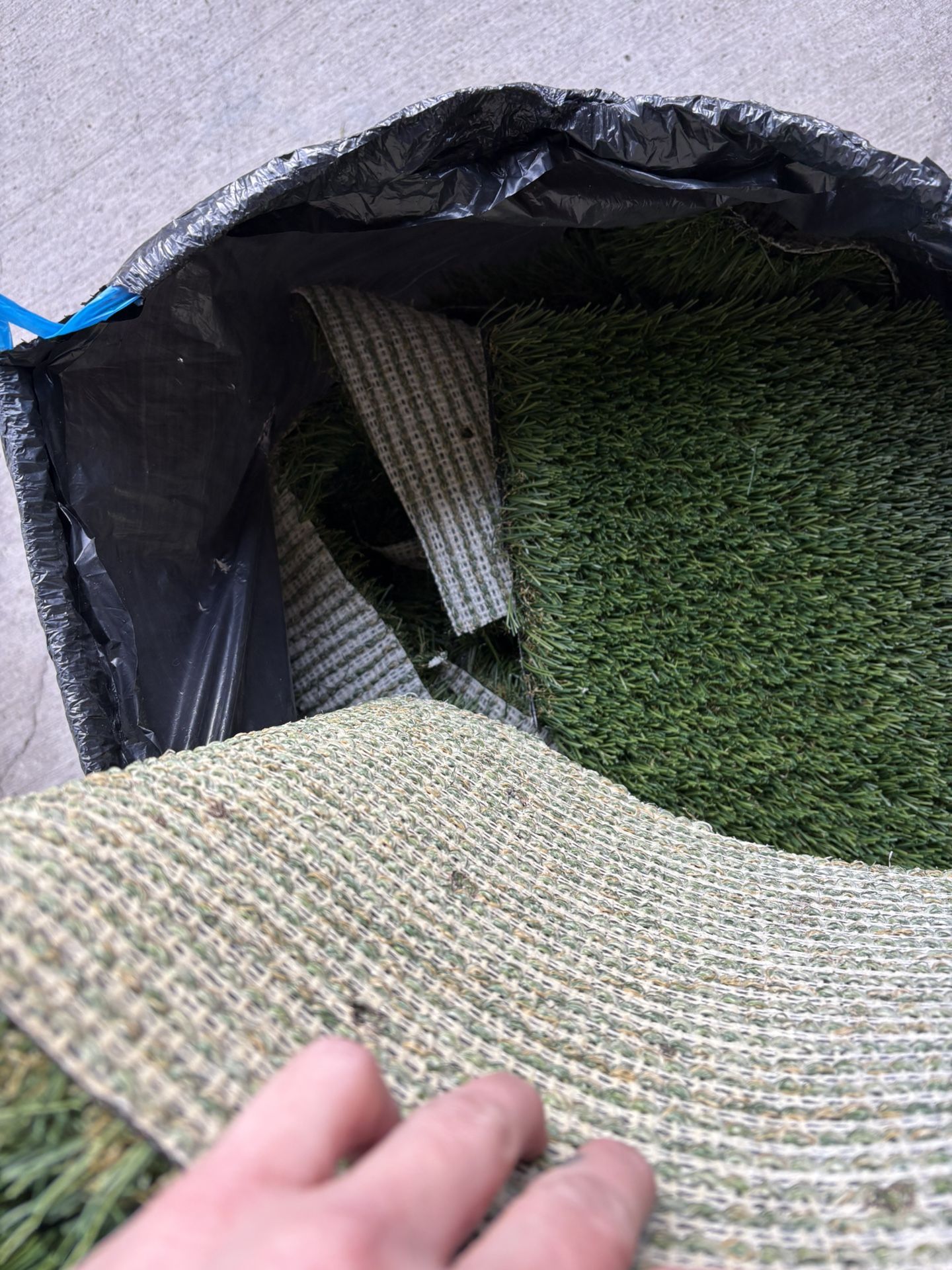 A bag of skinny strips of lifeproof petproof artificial grass (would be good for small lining decorations to be glued etc). All pieces are clean, just left over from my big cuts. Also a work lamp (works, does get hot with prolonged use). A set of solar lights