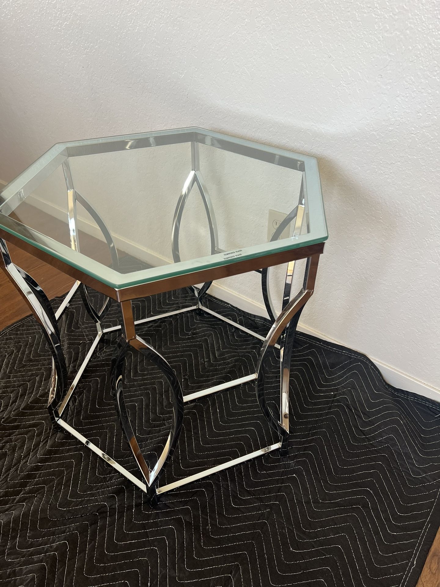 NEW AND ASSEMBLED BEAUTIFUL SIDE TABLE CHROME GEOMETRIC SHAPE TEMPERED GLASS TOP 26"L X 26"W X 24"H CLEARANCE $95🤩 REG. $239.99 PICK UP ONLY VISALIA