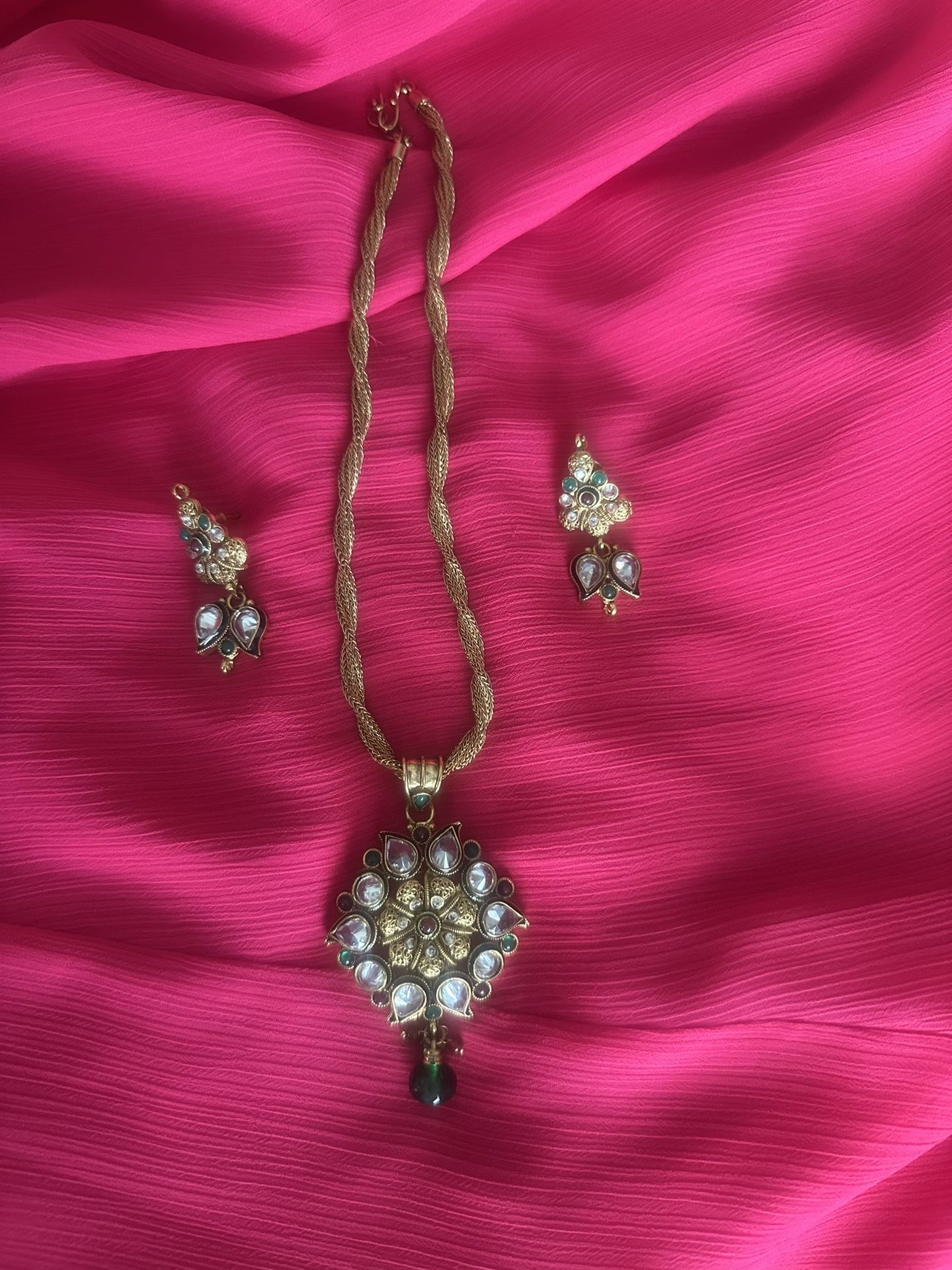 NWOT Premium Gold-tone Kundan, Green Beads Necklace, Pendant + Earrings + chain