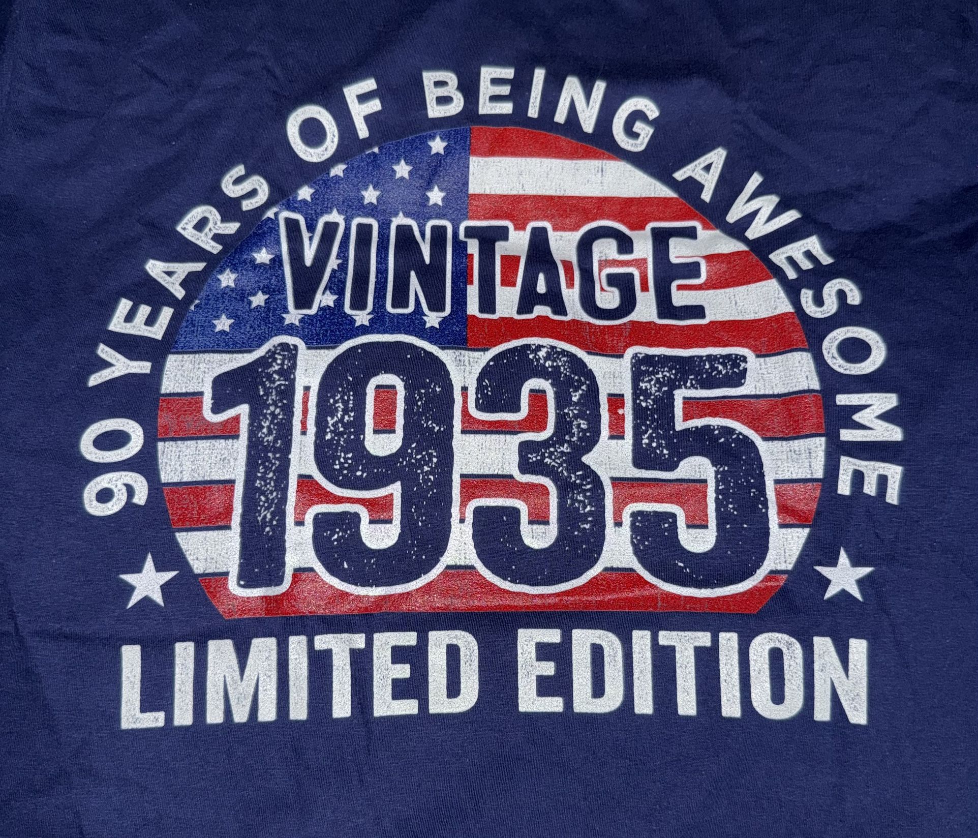New without tags. Unworn. The product is a Port & Company men's T-shirt in size medium, perfect for celebrating a 90th birthday. The shirt features a navy color with a birthday theme, making it a stylish and unique decoration for the special occasion. With a regular fit and clever design, this shirt is sure to be a fun and comfortable addition to any birthday celebration!