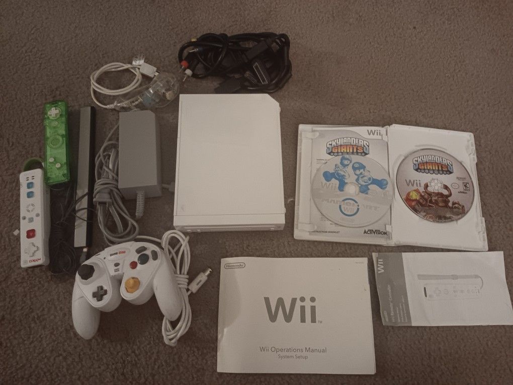 Nintendo Wii Complete with universal av cord , original power plug ,original sensor bar 2 aftermarket wiimotes 1 nunchuck ,1 white games stop controller for Nintendo Wii or GameCube and 2 games. This system is in very good condition Mario Kart Skylanders Please feel free to view other items on my page