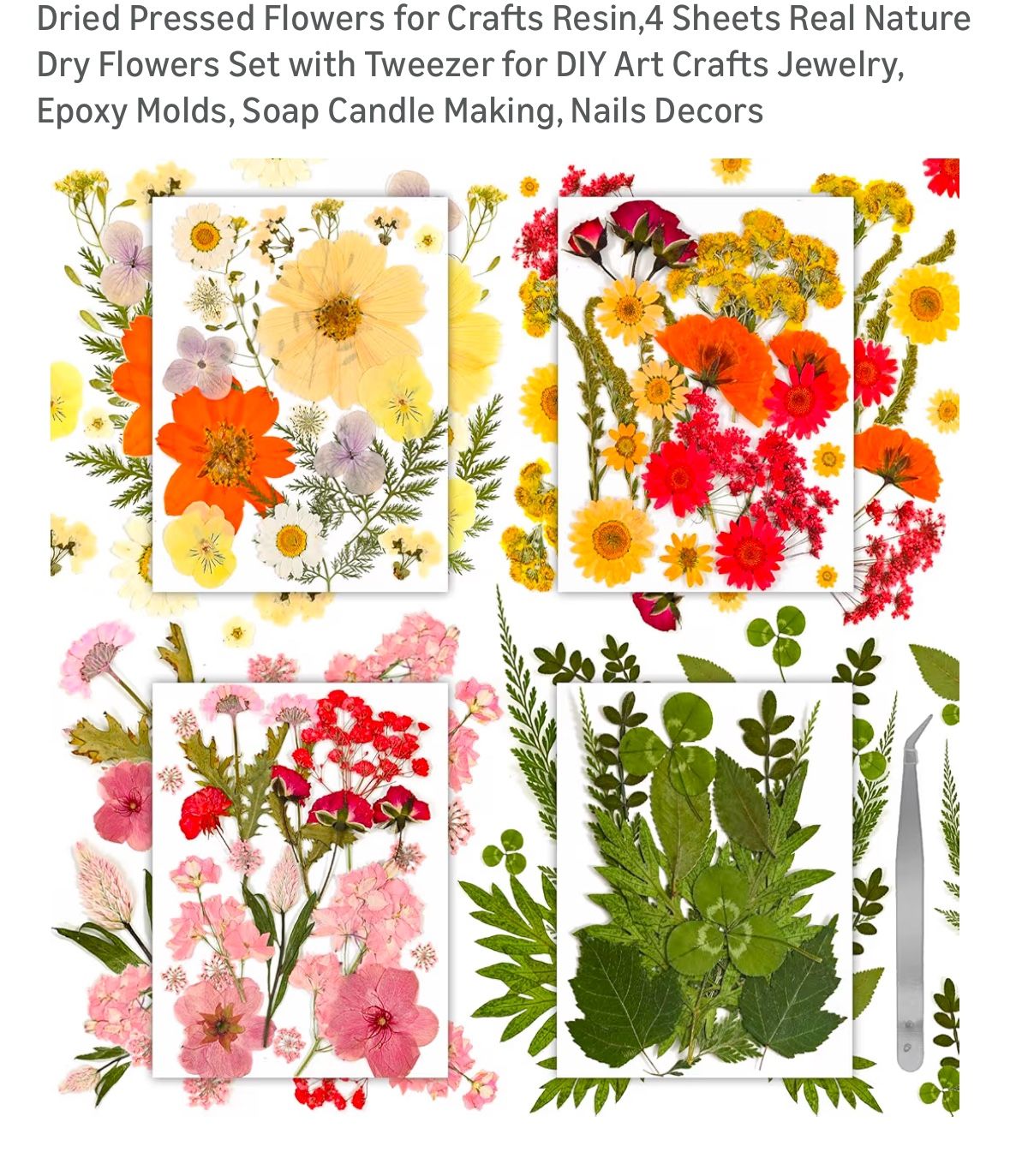 Dried Pressed Flowers for Crafts Resin,4 Sheets Real Nature Dry Flowers Set with Tweezer for DIY Art Crafts Jewelry, Epoxy Molds, Soap Candle Making,