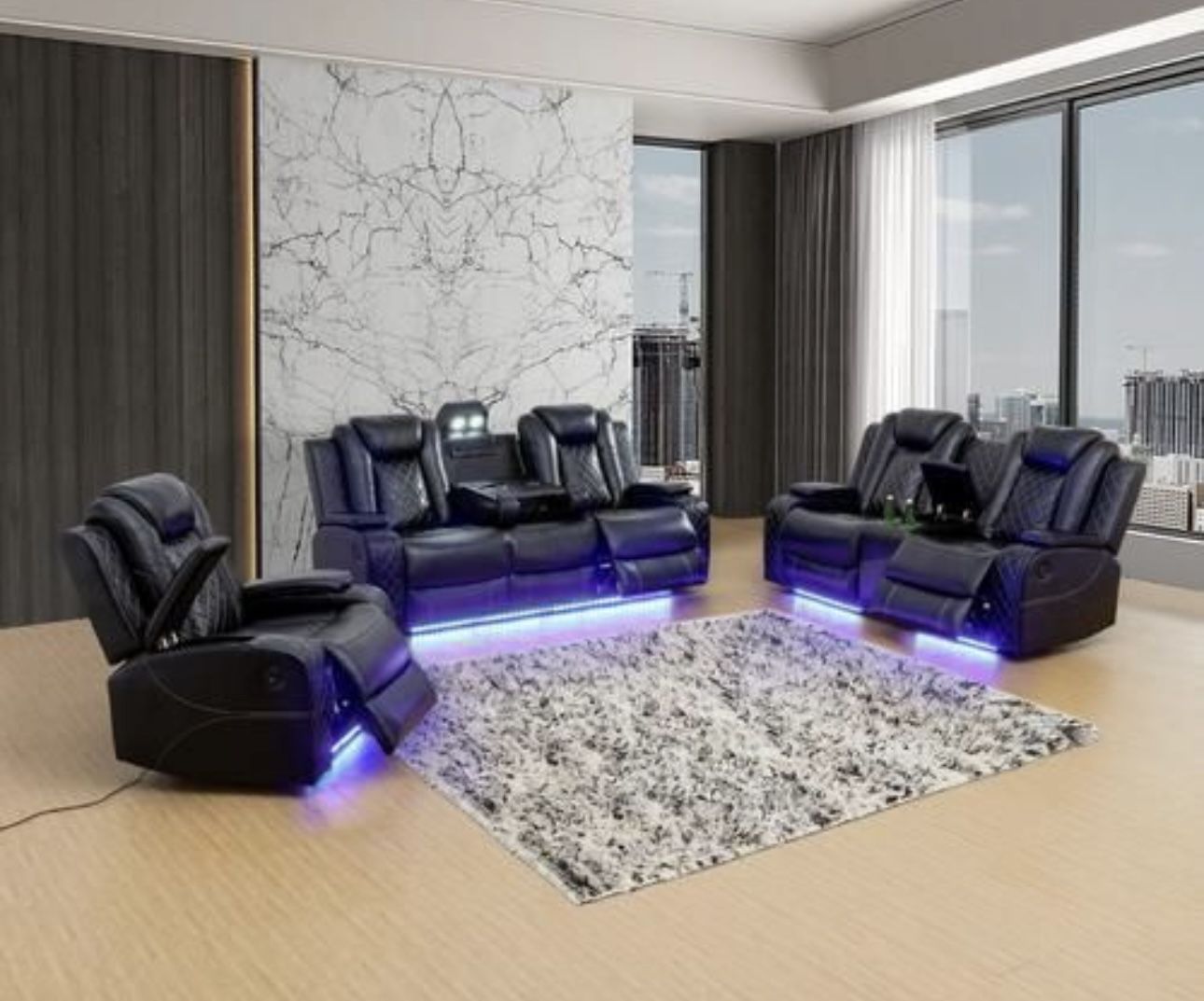 Power Electric Black Leather Fully Reclining Three Piece Couch Set