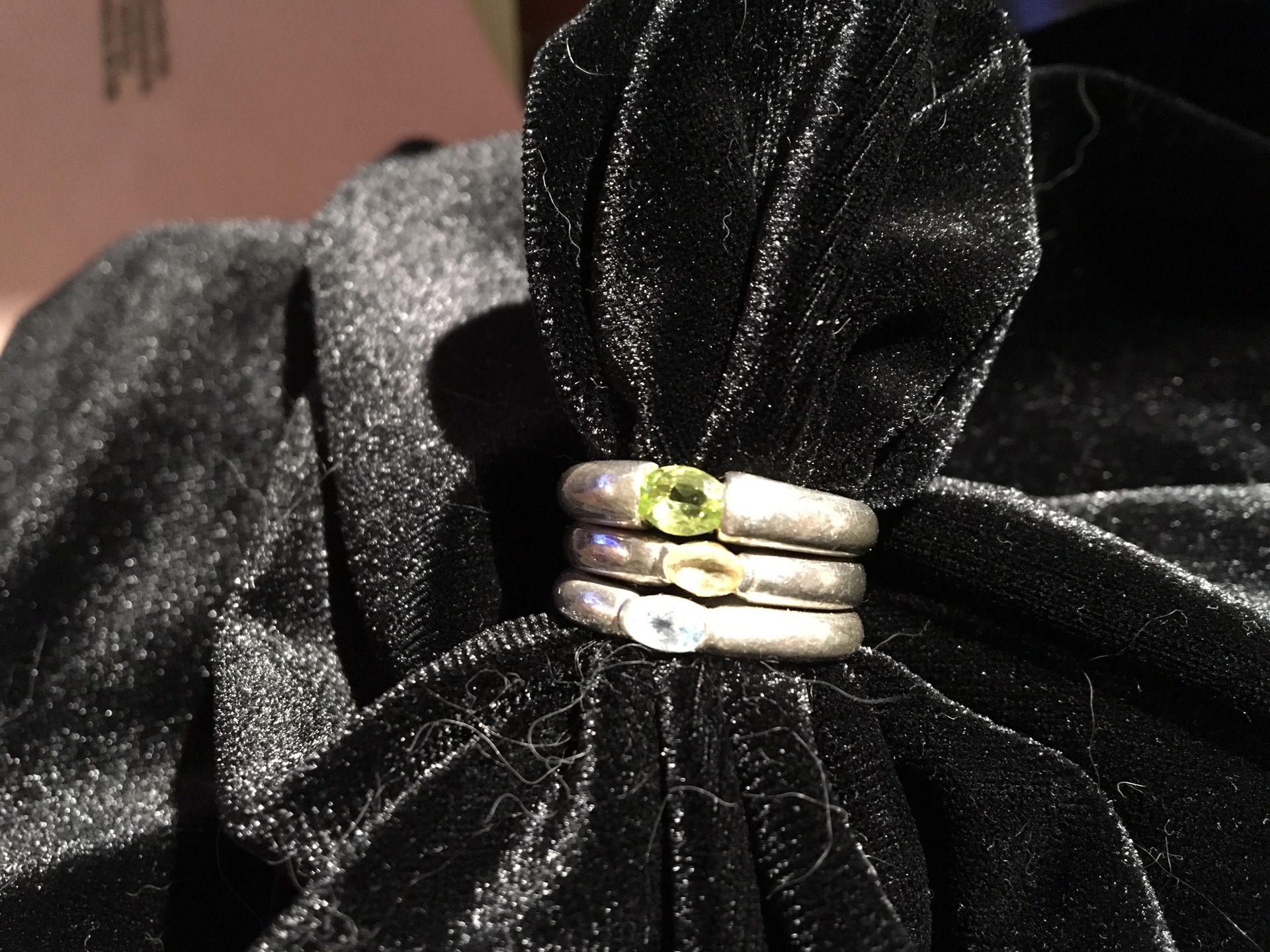 Three Sterling silver stack rings with blue topaz , citrine and peridot. Size 7