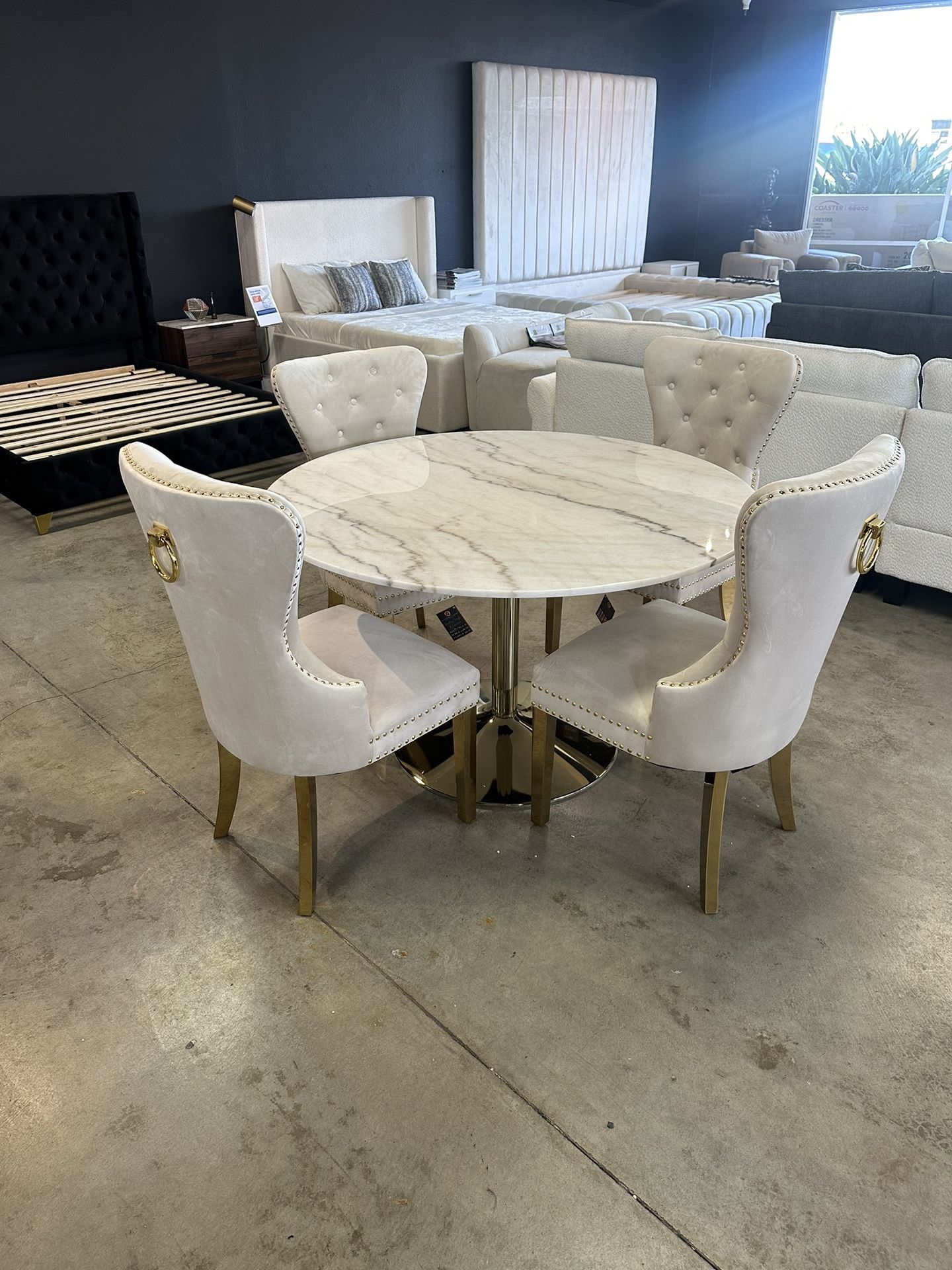 We are clearing our warehouse& display for BELOW RETAIL pricing, new & classic designs all never used items. Featuring 51” white marble table with gold stainless steel pedestal 4 heavy duty cream chairs with gold legs & accents FREE DELIVERY & NO CREDIT FINANCING ✅ More models available upon request Habló español im here to help 👍🏻