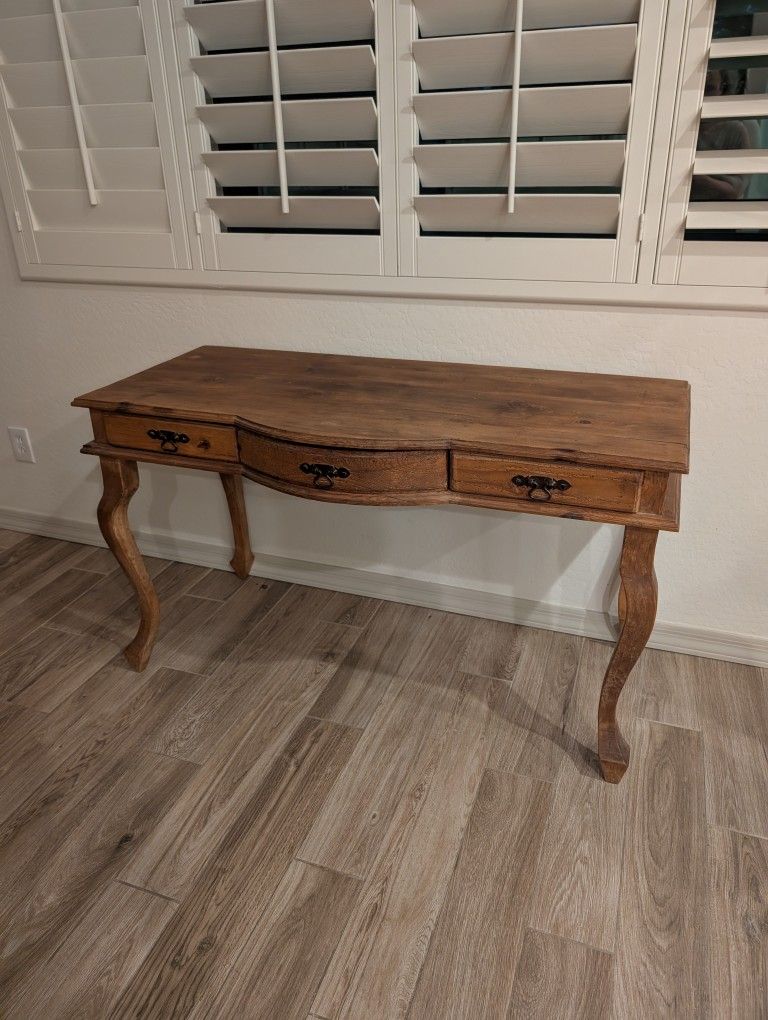 Solid pine desk or table with gorgeous patina and worm wood detailing.
