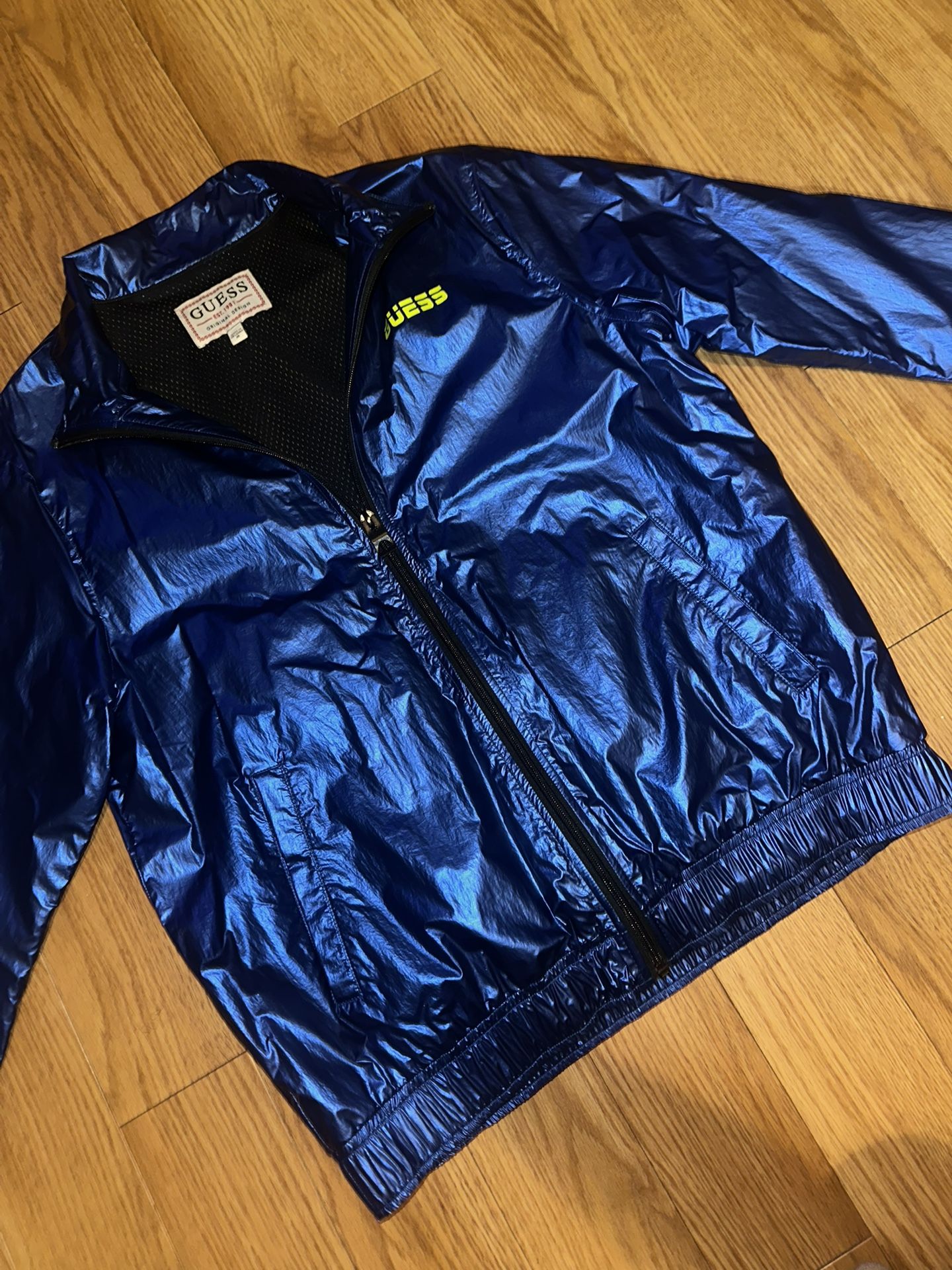 Guess track jacket with a metallic blue finish. Features a full zip-up front and logo on the chest. Size Medium. Made in Sri Lanka.