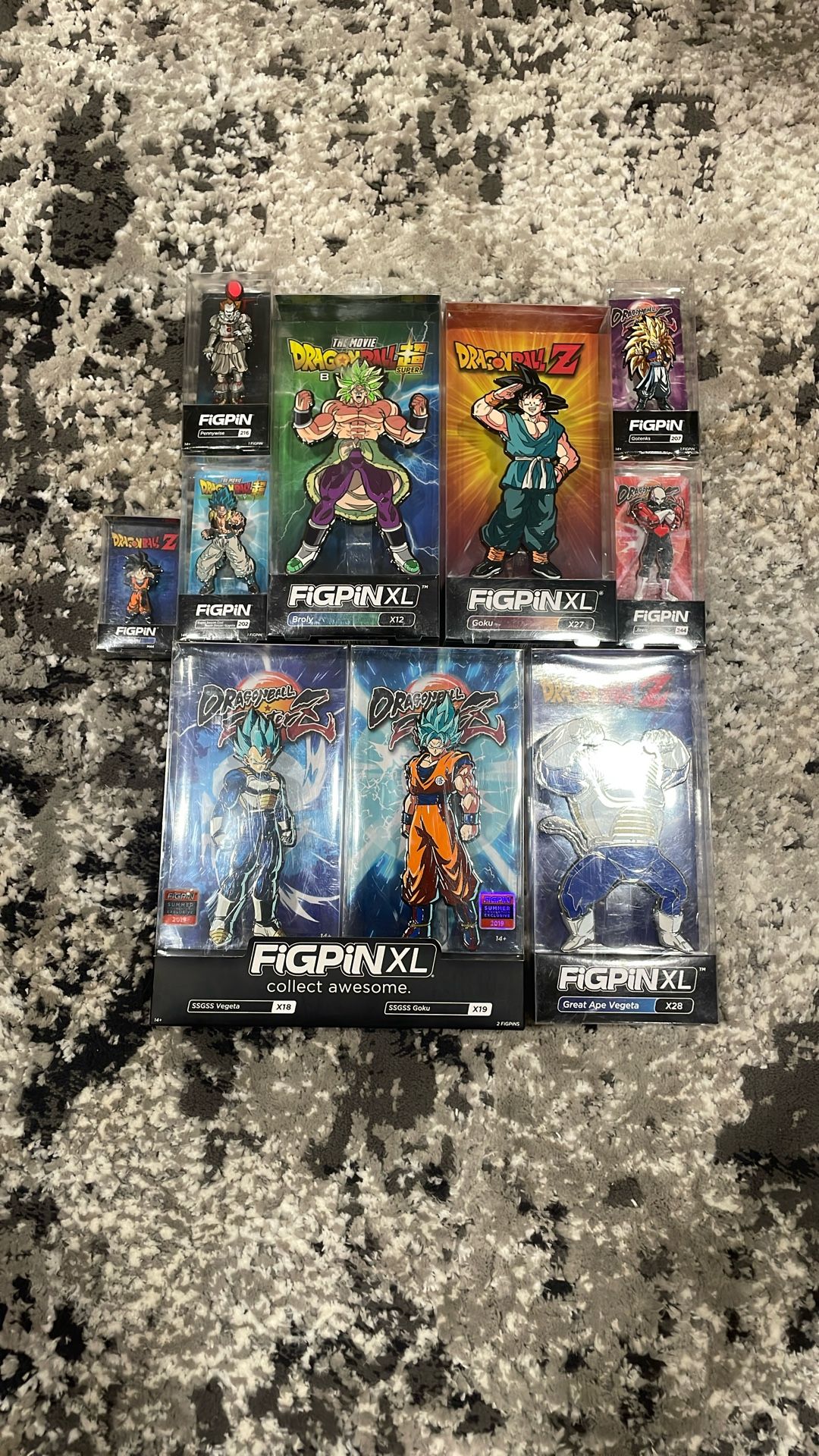 Dragon Ball Z/Super/FighterZ Figpin Collection +IT Comes in Box Never opened 216 Pennywise 244 Jiren 207 Gotenks 202 SSGSS Gogeta m44 Goten X28 Great Ape Vegeta X27 Goku X12 Broly X18 + X19 SSGSS Vegeta and Goku $10 each regular or mini $20 each xl $40 for X18+X19 obo Pickup Only Riverside Area *I have other DB figure collections ask if interested* *Willing to trade/discount for Pokemon games send offers*