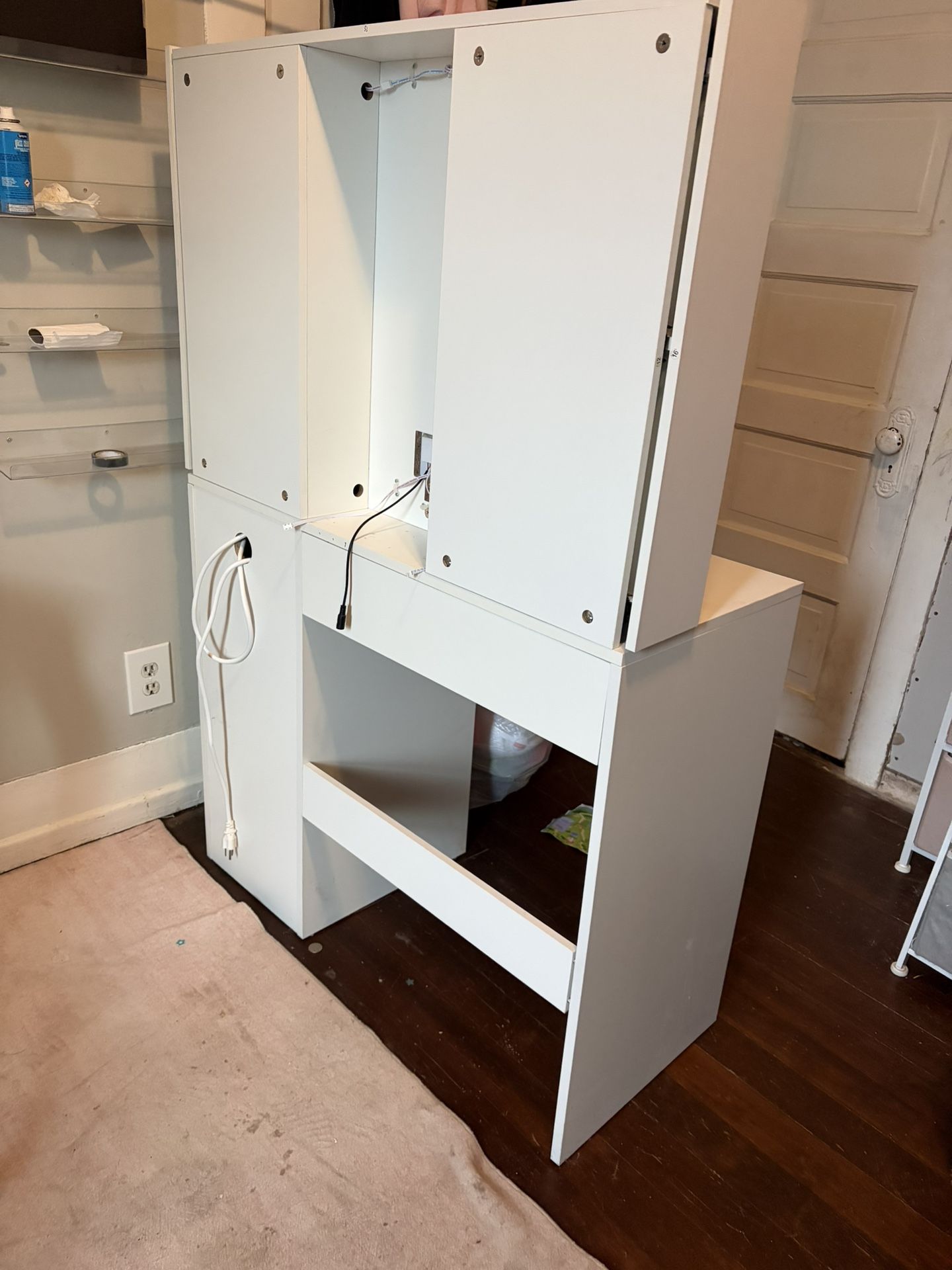 White vanity with four drawers. The sides pull out and give extra storage. Some of the screws do need a little tightening. I couldn’t figure out how to do the wiring for the light so I’ve never turned it on. It has a power strip on the side. That works perfectly. In general needs a little TLC. I’m moving and need it gone ASAP