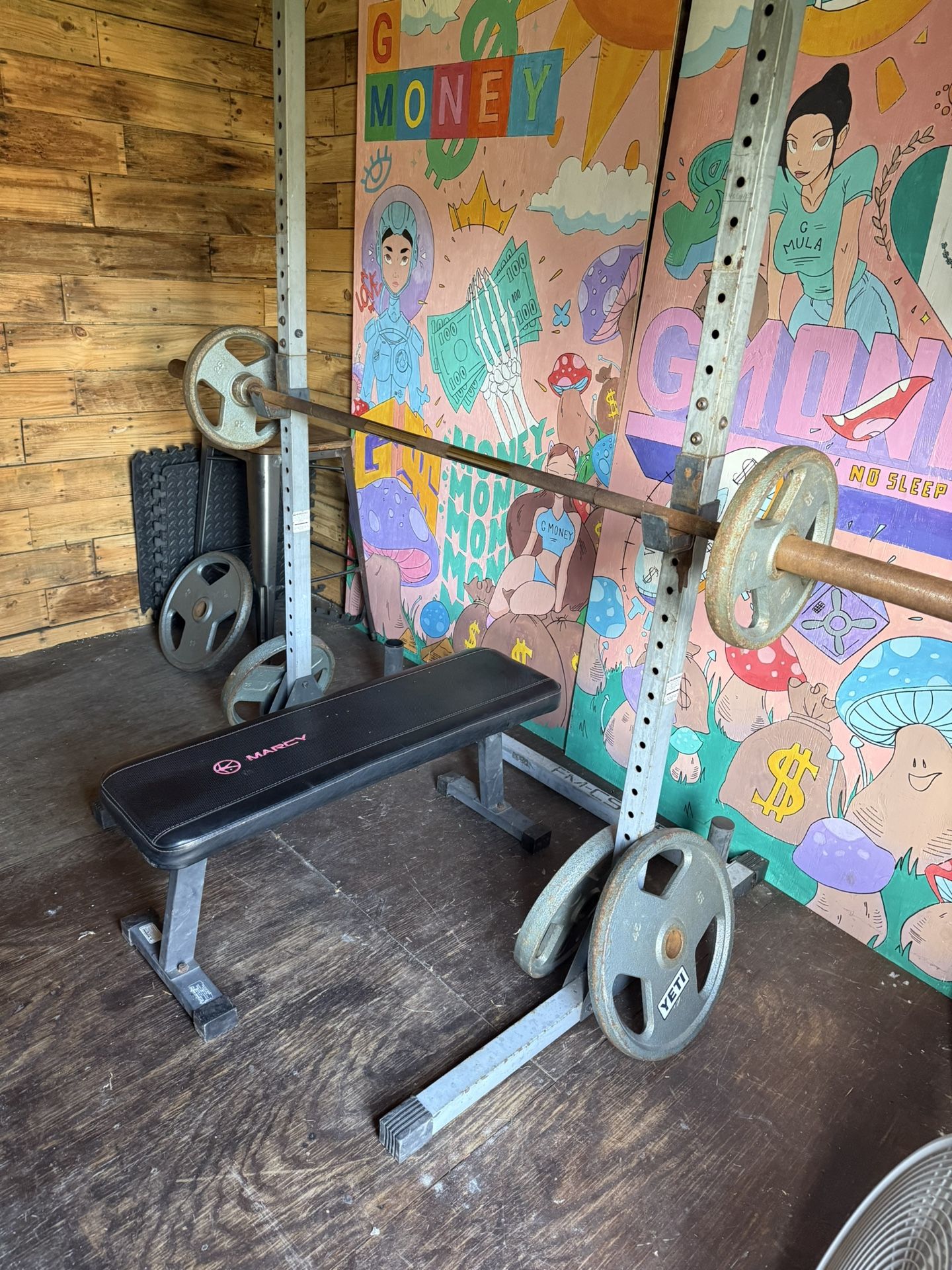Includes both benches , dumbbells , weights , kettlebell, dip bar, pull up bar