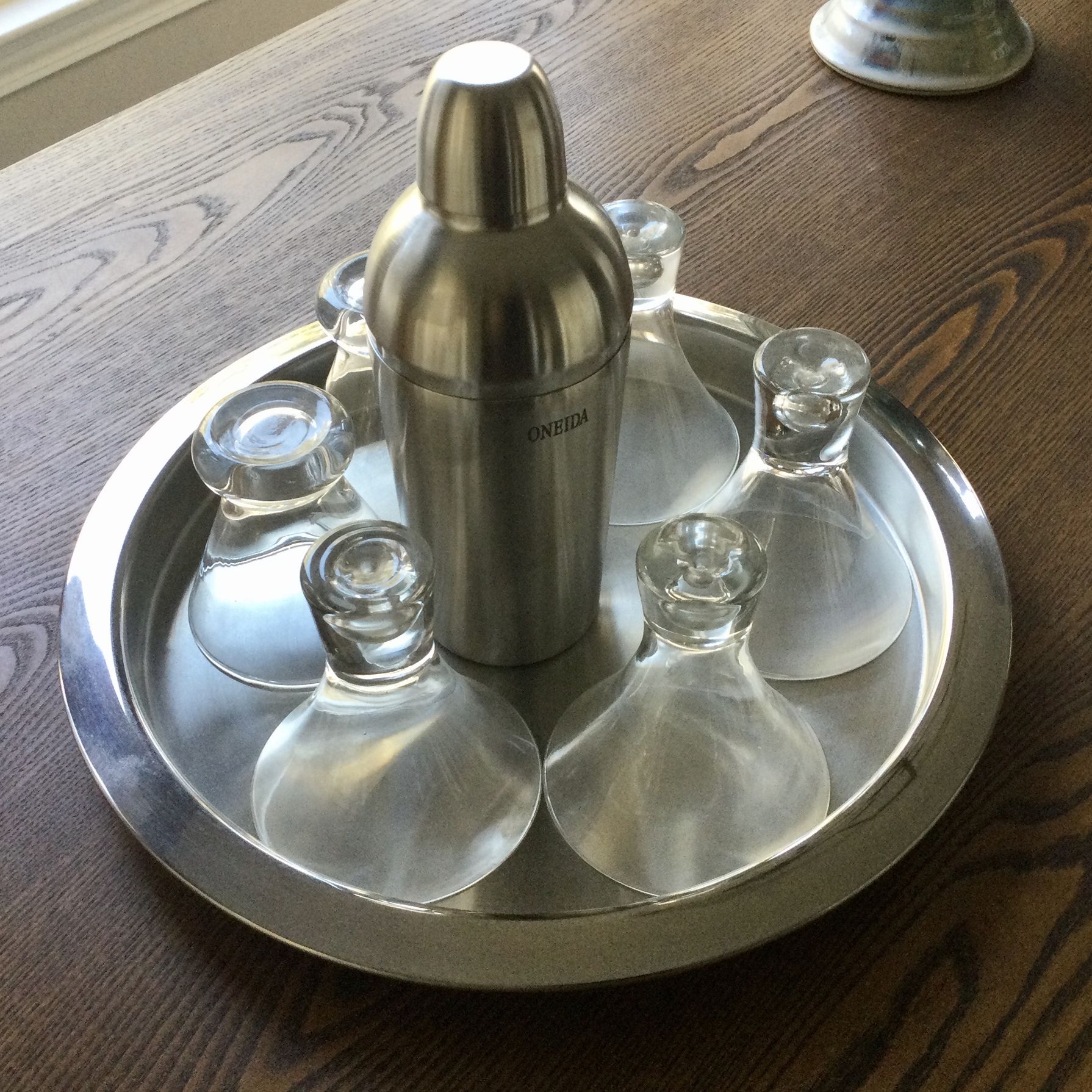 1990's - Vintage Oneida Stainless Steel Bar Set Open box - Never used - Displayed in dining room hutch 14" Round Tray 20 oz. Shaker 6 Cocktail/Martini 6 oz. Glasses