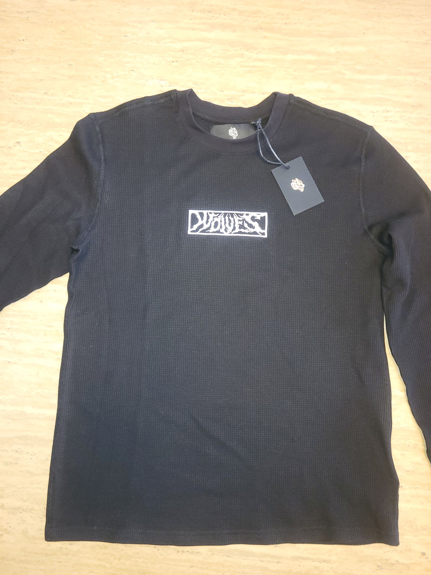 π― PREMIUM SOLD OUT black long-sleeve top is the Darc Sport Spider in the Night "Premium" Oversized Tee. It is characterized by its textured waffle-knit fabric and a distinctive white rectangular logo on the chest that reads "WOLVES." Product Details Brand: Darc Sport Design: Features a white "WOLVES" graphic inside a rectangular border. Style: Long-sleeved, MEDIUM oversized fit. RETAILS $125