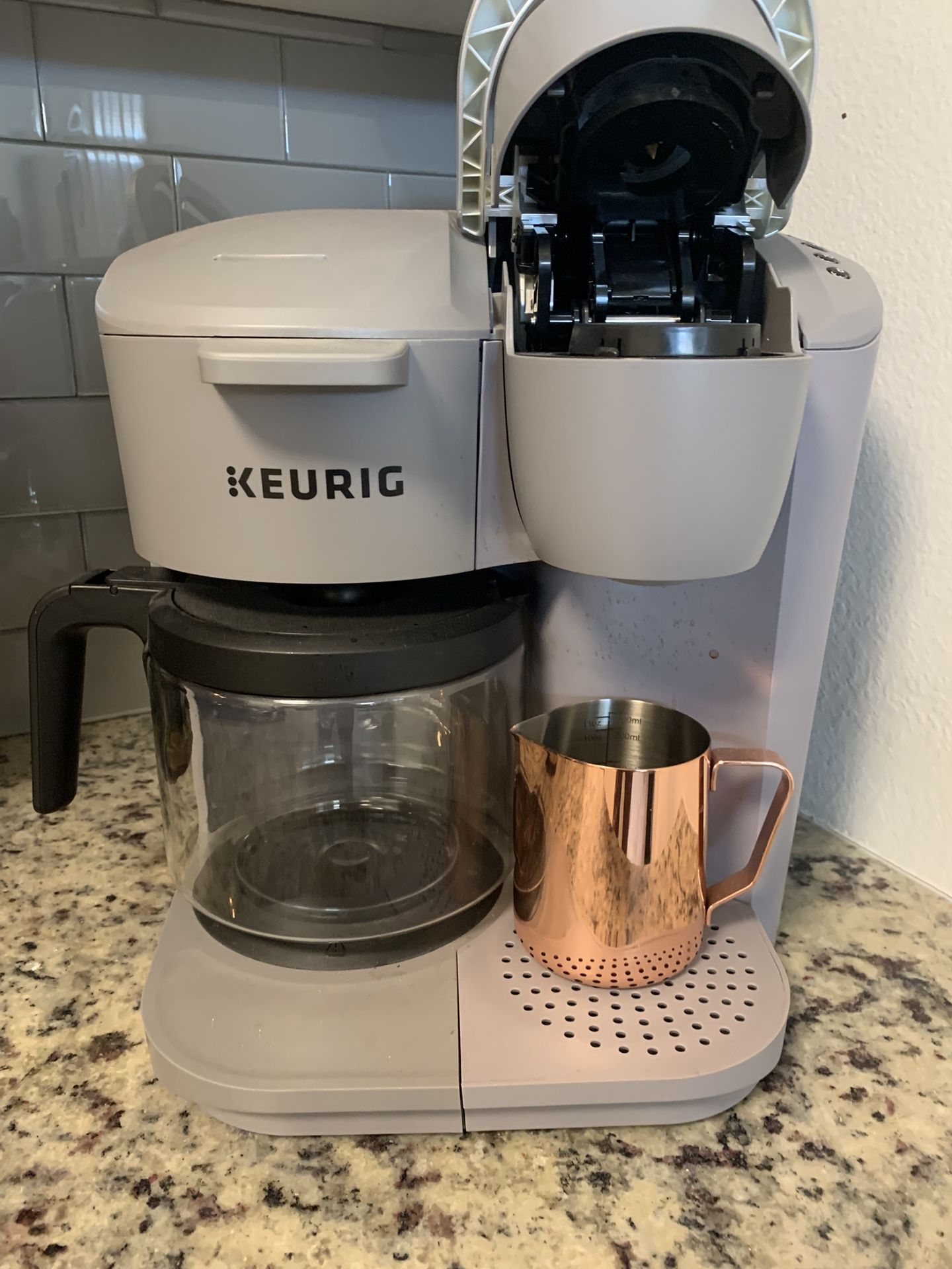 The keurig duo - good for the pods/instant cups or brewing a full pot of coffee. Like new, unboxed and used once. Just sits in my kitchen. Works great, easy and really convenient for mornings on the go. I think these go for $150-$200 new at Target or wherever so you’re getting one basically new just out of the box for more than half that cost.