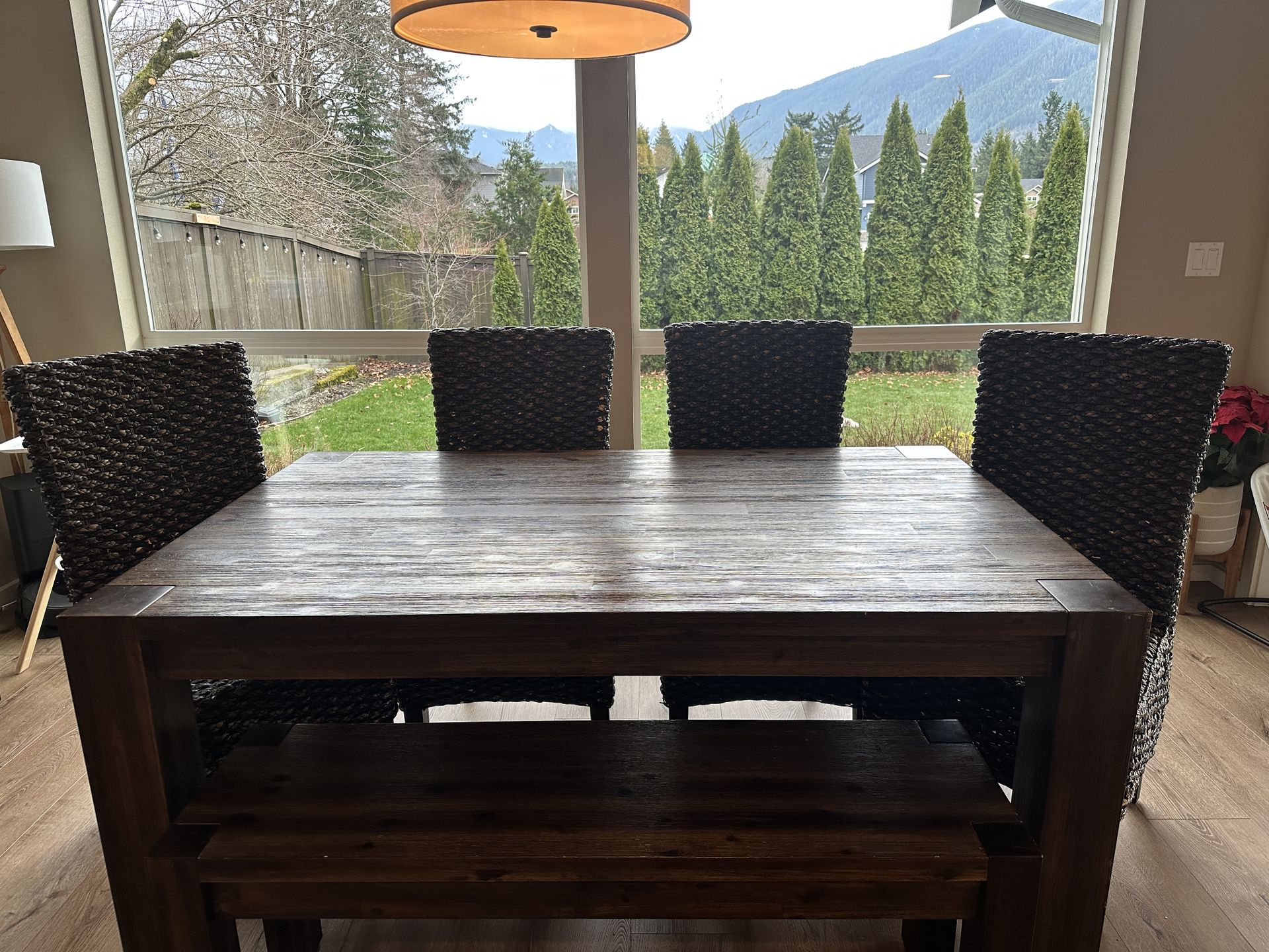 8’ dining table with included removable leaves. The table includes a seating bench and four chairs. Table is in very good condition. There are minor lighter color blemishes on the top and some scuffs on one chair (pictures included). Table is 5’3” (without leaves) and 3’3” in width.