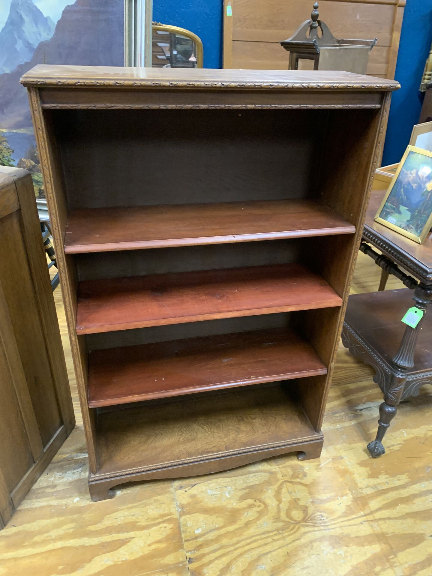Vintage Dark Wood Bookcase. A couple of the shelves are a different color. Measures about 30” wide, 10” deep, and 46 1/2” tall $115 + sales tax Please see photos for location and other info