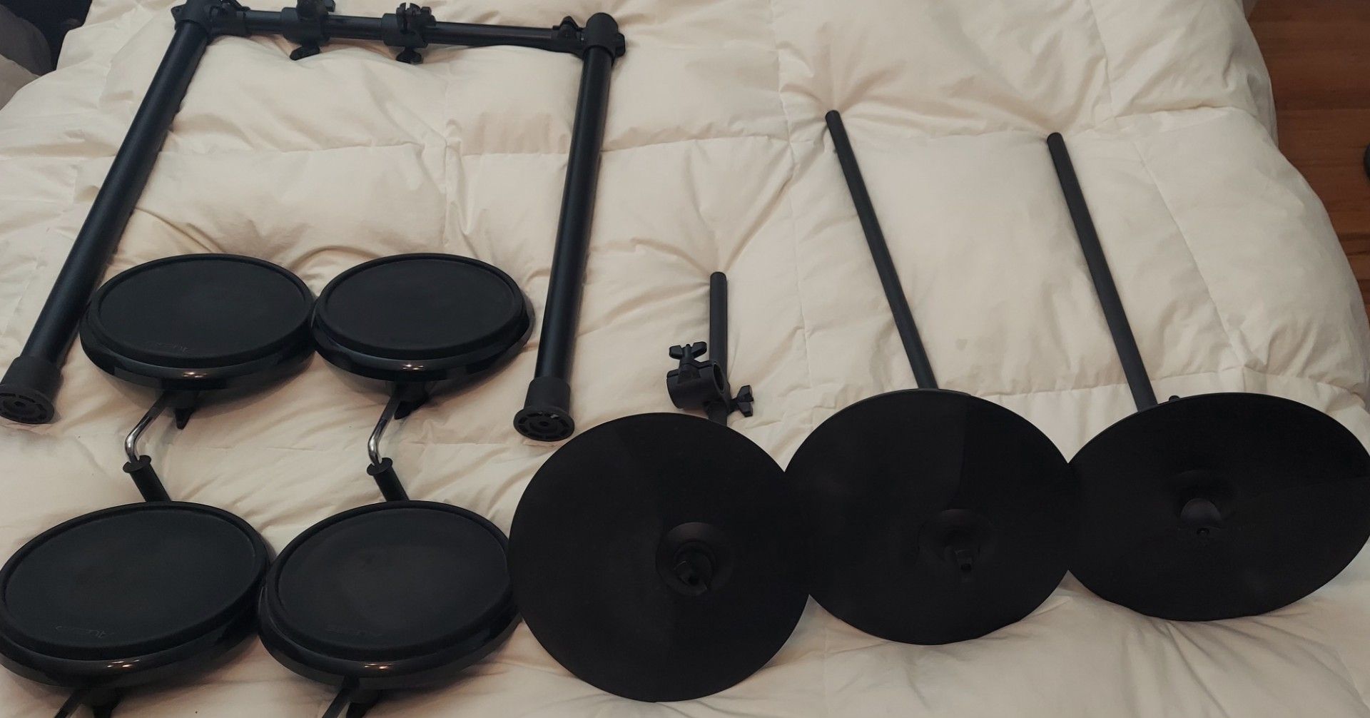 3 Alesis 10-inch electronic cymbal pads Size: 10 inches in diameter. Functionality: Single-zone trigger designed for crash or ride sounds. Includes mounting brackets and arms as shown in photos. 4 Alesis 8" Dual Zone Pads Alesis 8-inch electronic drum pads, designed for use as replacement tom or snare pads on kits such as the Alesis Nitro or DM7X. Compatible with Alesis Nitro, DM7X, and DM6 drum kits. Features a durable rubber surface designed for quiet practice. Includes mounting brackets for attachment to a drum rack as shown in photos. Also included is 1 section of rack as shown in photos. Get everything for $120 drummer drumming kit equipment batteries percussion