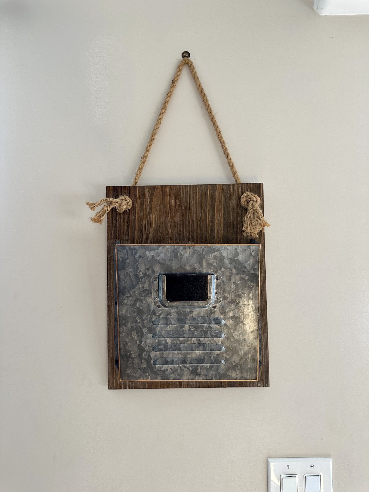 Industrial Mail Or Magazine Wall Holder. 16 inches by 12.5 inches. Wood, some kind or metal/tin and rope.