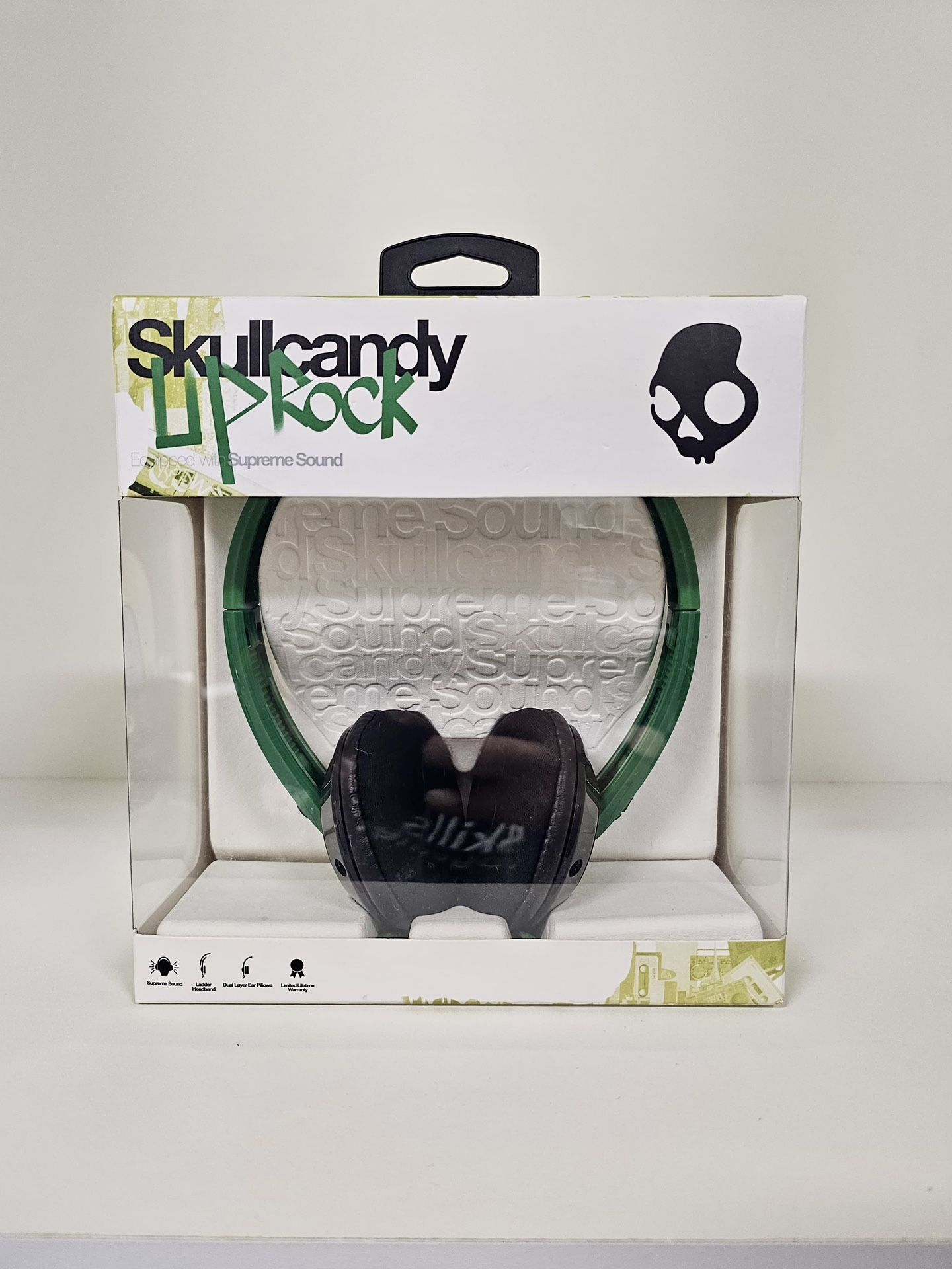 Lot of 10 Brand New Corded Headphones Brand: Skullcandy Supreme Sound Uprock Model: S5URDZ-217 Color: Green Rasta Type: Wired on-ear headphones Drivers: 40mm drivers for powerful sound and bass Sound: Features "Supreme Sound" technology, delivering attacking bass, natural vocals, and precision highs Cable: Tangle-free flat cable with a 1.2-meter (3.93 ft) length Connector: 1/8" (3.5mm) gold mini connector Design: Lightweight and ergonomic with soft, comfortable ear pillows Compatibility: Compatible with devices that have a 3.5mm jack, such as MP3 players, smartphones, and laptops