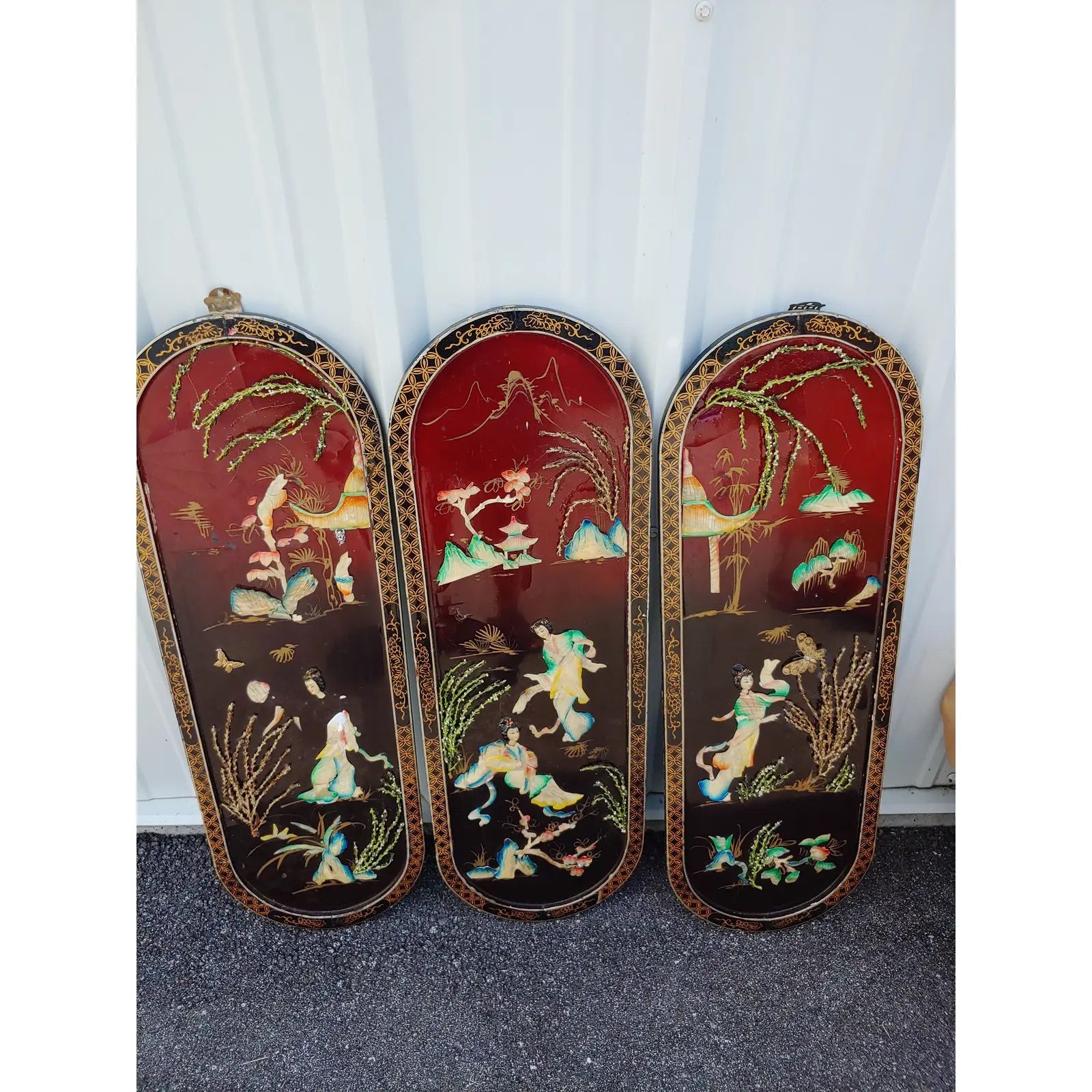 Set of 3 Asian oriental Vintage wall plaques. Beautifully made with shells. This will go with any decor in the home for oriental art lovers. less DIMENSIONS 11ʺW × 2ʺD × 34ʺH