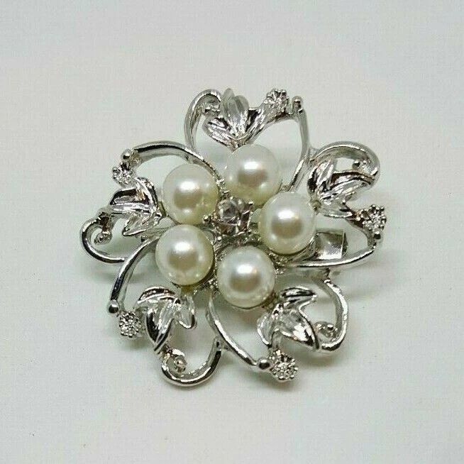 Silver tone flower brooch with faux pearls and clear crystal rhinestones.