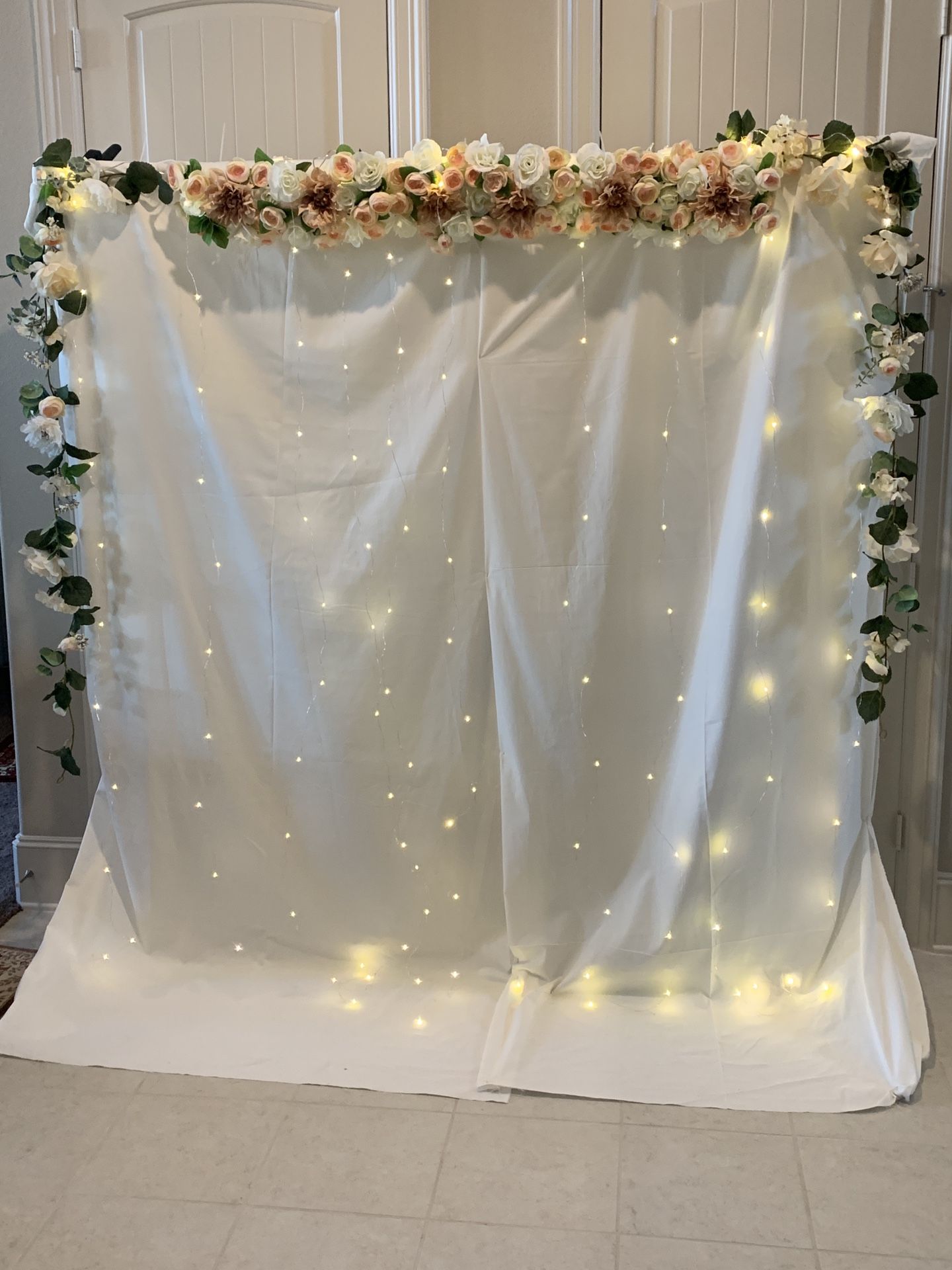 PLEASE READ 6 feet by 6 feet . Includes the lights and everything in the picture. Selling for cheap because it was for a party and now I don’t need it. The flowers alone cost me around $85 Made and used once for party. It is made using pvc pipes for the structural part. Held up good all night. Perfect for pictures! Can even be used for a wedding! This price if for pick up and will be dissembled. Willing to drop off at desired location and assemble for extra $30-40 depending on location.