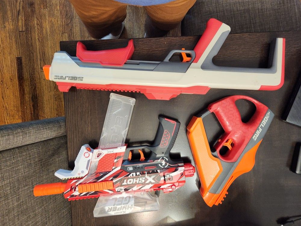 X shot needs battery recharge Small nerf needs bootle for bullets Big gun needs bottle. Selling all together for cheapest price ever 22$ I m shipping it