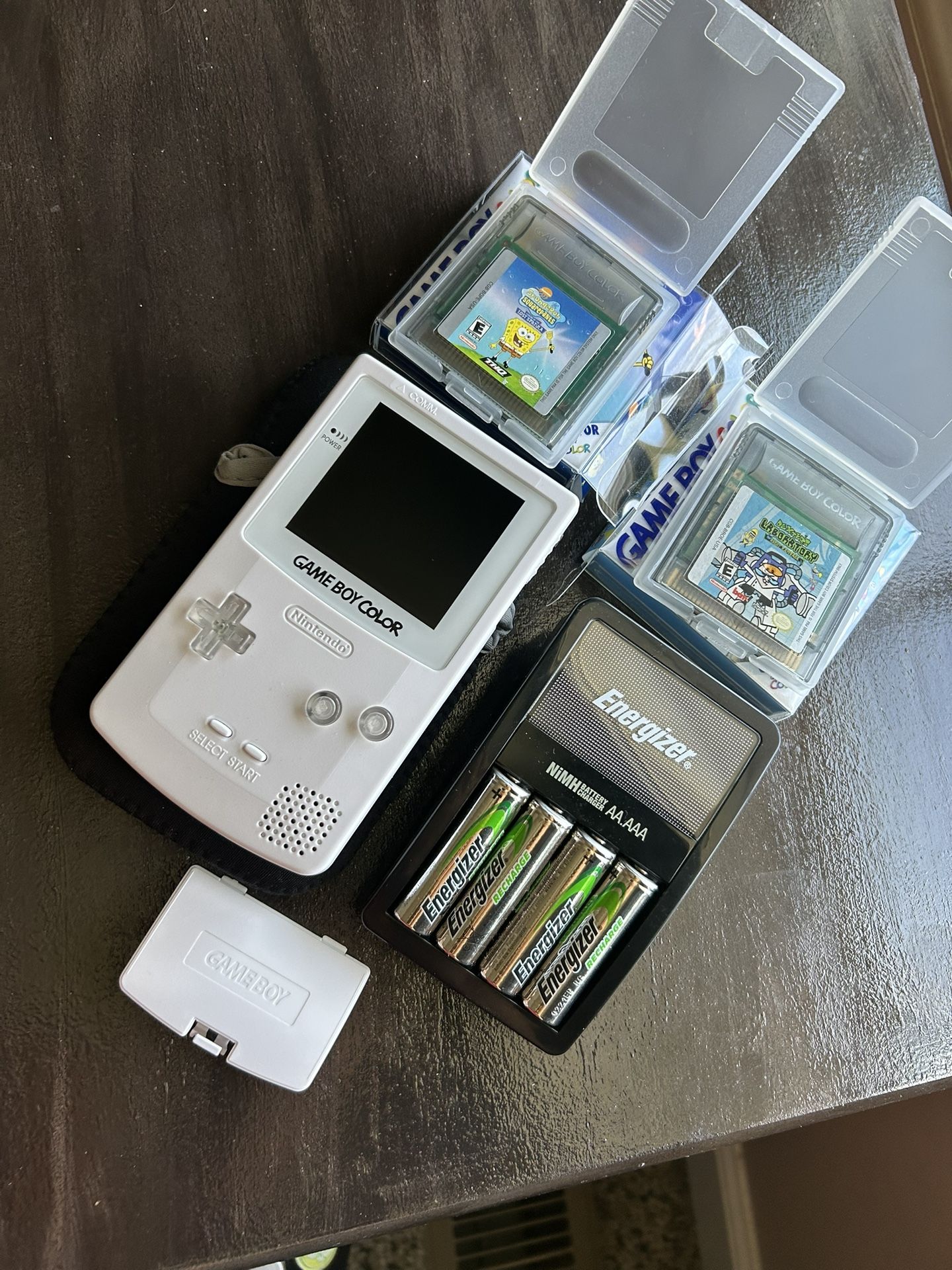(OBO)Gameboy color white shell IP SCREEN upgrade changes brightness with touch sensor on top. Works amazing will also include the rechargeable batteries kit it does come with if interested. If only interested in handheld we can talk price or for it, of if just single items we can talk also. And pouch comes with it. If you want the whole GBC and batteries, willing to throw in a free Gameboy color game. (Message me for options).