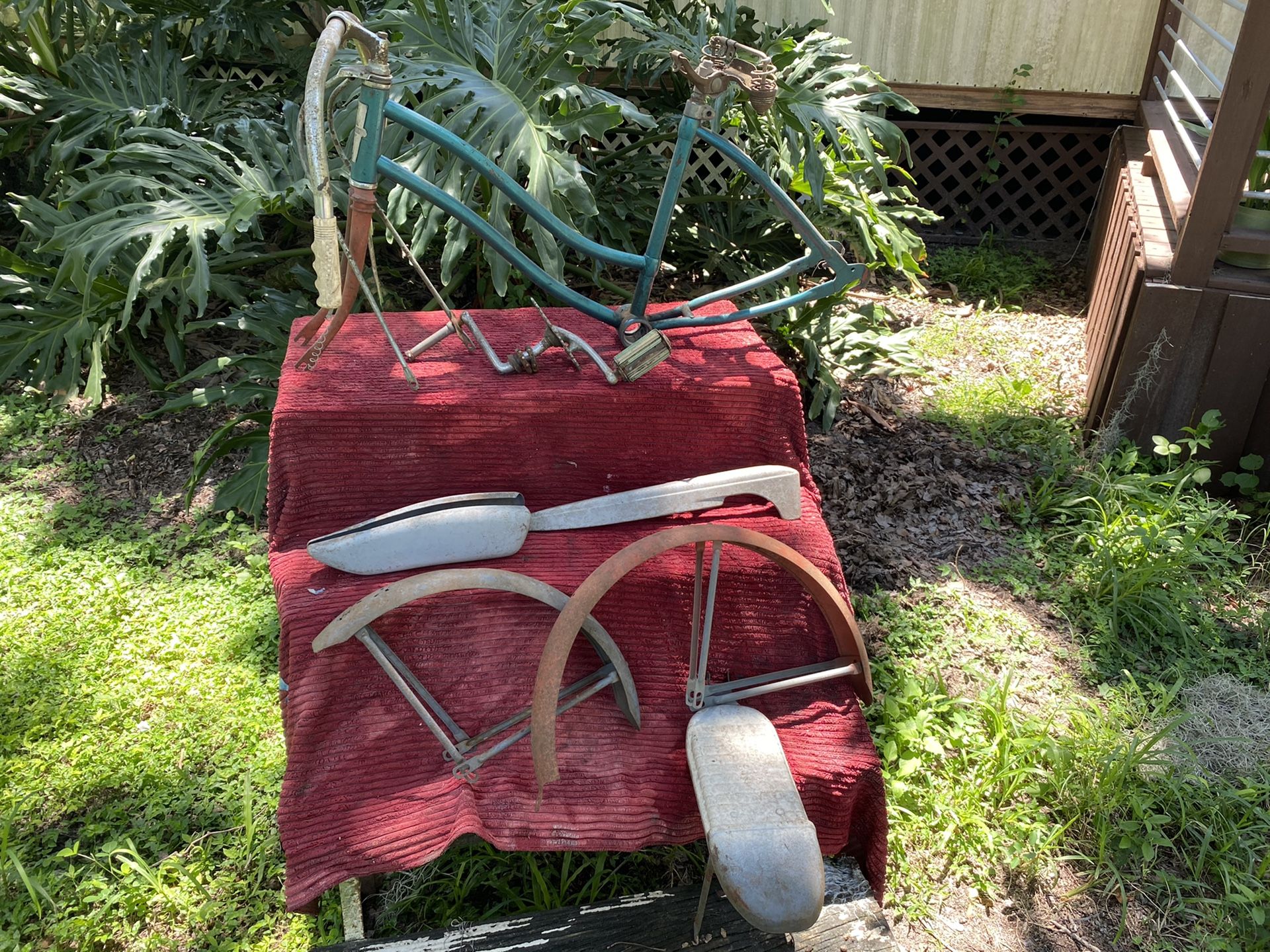Antique girls western flyer bike. I have frame handle bars two fenders gas tank chain guard and luggage rack. I also have seat for it. $50