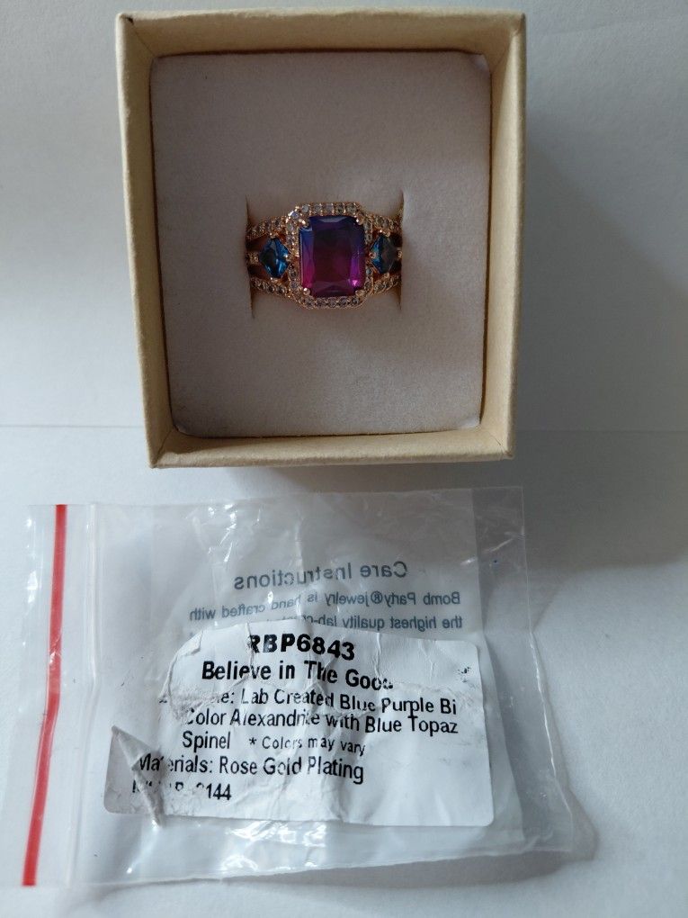 Size 10 Bomb Party Ring Believe In The Good RBP6843 MAIN STONE: Lab Created Blue Purple Bi Color Alexandrite with Blue Topaz MATERIALS: Rose Gold Plated MSRP: $144