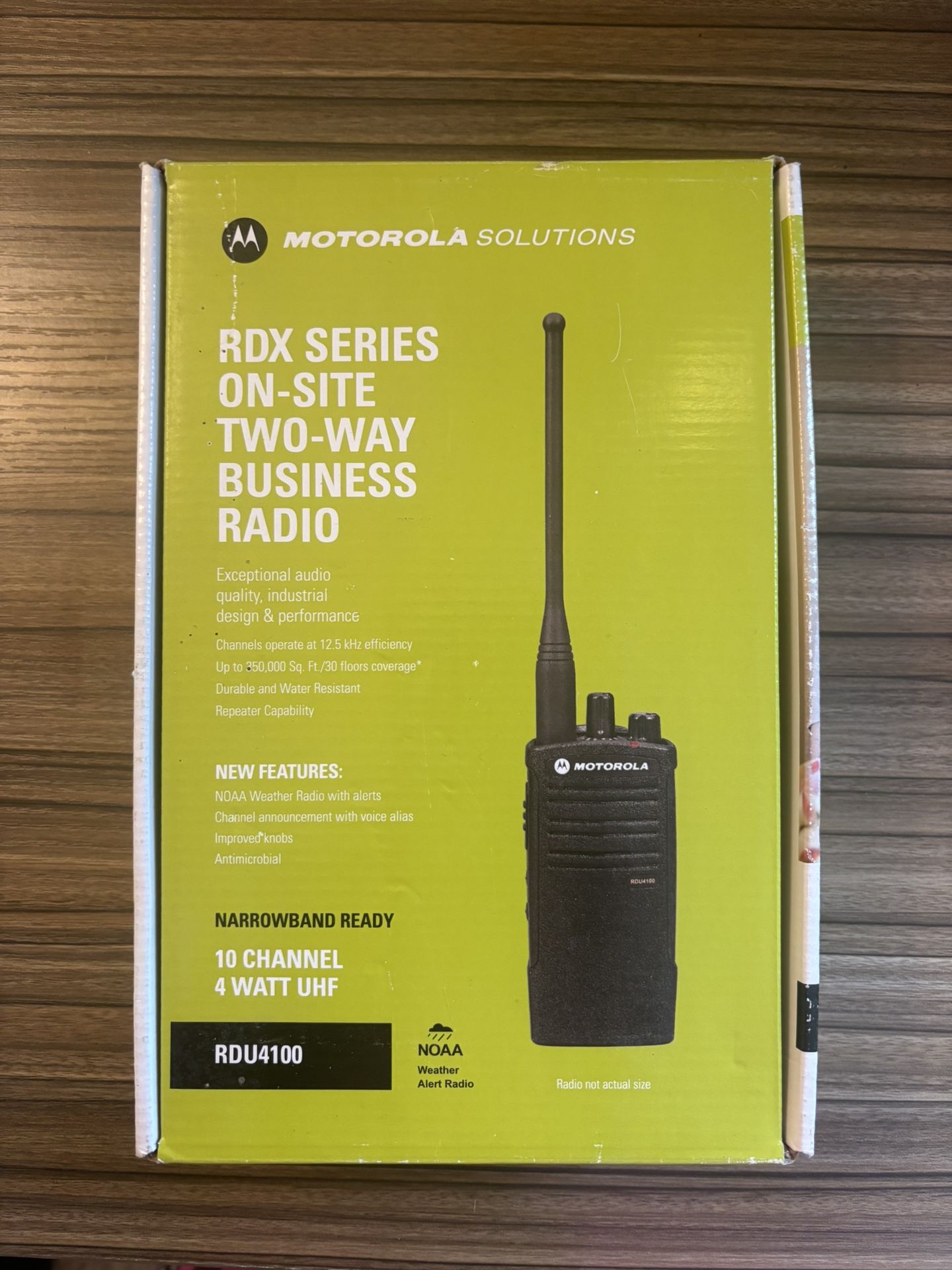 I have 6 new Motorola business Radios for sale! they are not sold individually, they must be sold as a set. :RDX SERIES ON-SITE TWO-WAY BUSINESS RADIO Exceptional audio quality, industrial design & performance Channels operate at 12.5 kHz efficiency Up to 350,000.Sq. Ft./30 floors coverage* Durable and Water Resistant Repeater Capability NEW FEATURES: NOAA Weather Radio with alerts Channel announcement with voice alias Improved knobs Antimicrobial M MOTOROLA NARROWBAND READY 10 CHANNEL 4 WATT UHF RDU4100